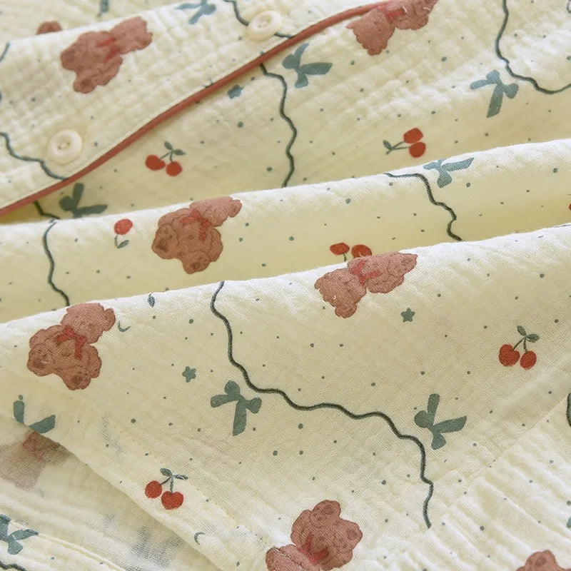 100% Cotton Crepe Women's Pajama Set 2024 New Spring And Autumn Cute Bear Printed Long sleeved Pants Two piece Loose Home Fury