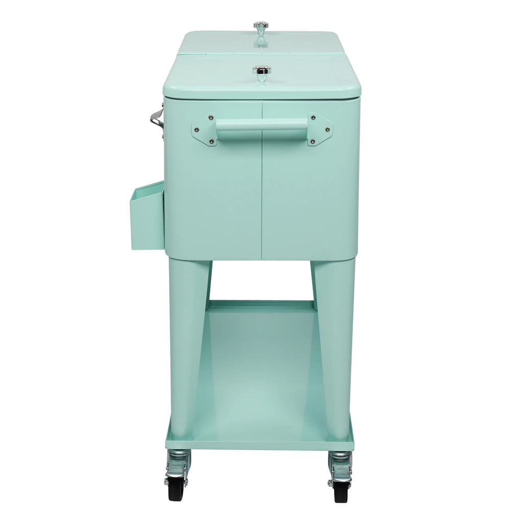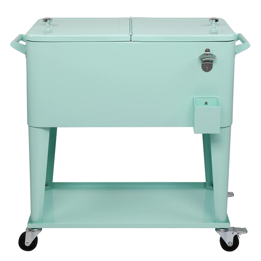 Level up your outdoor events with an all-in-one cooler cart! Fit all the cool refreshments you need with a large, 80-quart fill capacity, and the lower shelf provides extra space for extra beverages or other items you wish to store. Its insulated basin keeps your beverages cold for multiple hours with its injected molded insulation technology. The bottle opener and cap catcher help you easily remove and collect the caps, and the sturdy wheels provide easy mobility when the cooler is full with its locking casters. The drainage cap make it so convenient to clean up the cooler in a nap. Entertain yourself and your guests with this beautiful and high-quality rolling cooler cart!