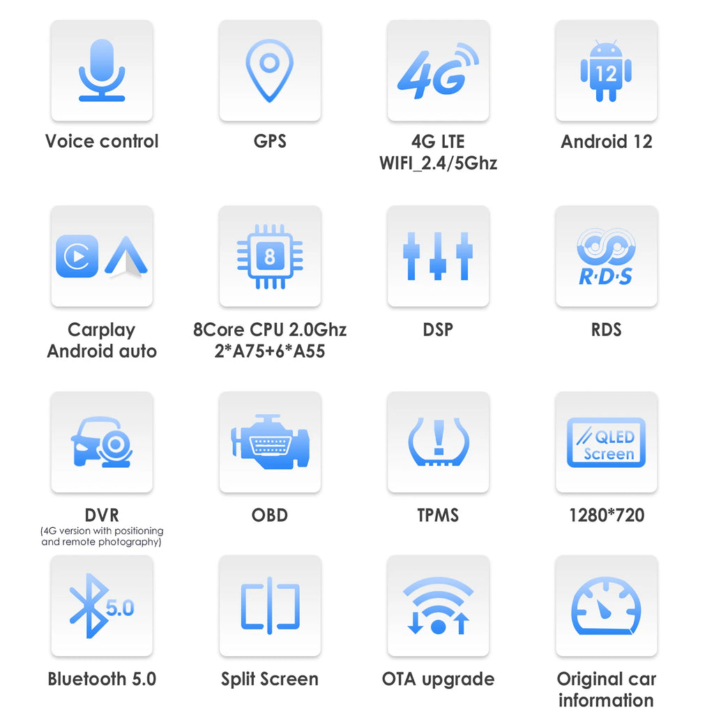 Special Features: Built-In Speaker/Microphone,wifi function,Support steering wheel control,Support 4G Network,Support Can-Bus,Built-in GPS,Mobile Phone,MP3 players,Voice control,dsp,CarPlay,android auto,Reversing Input,Split Screen