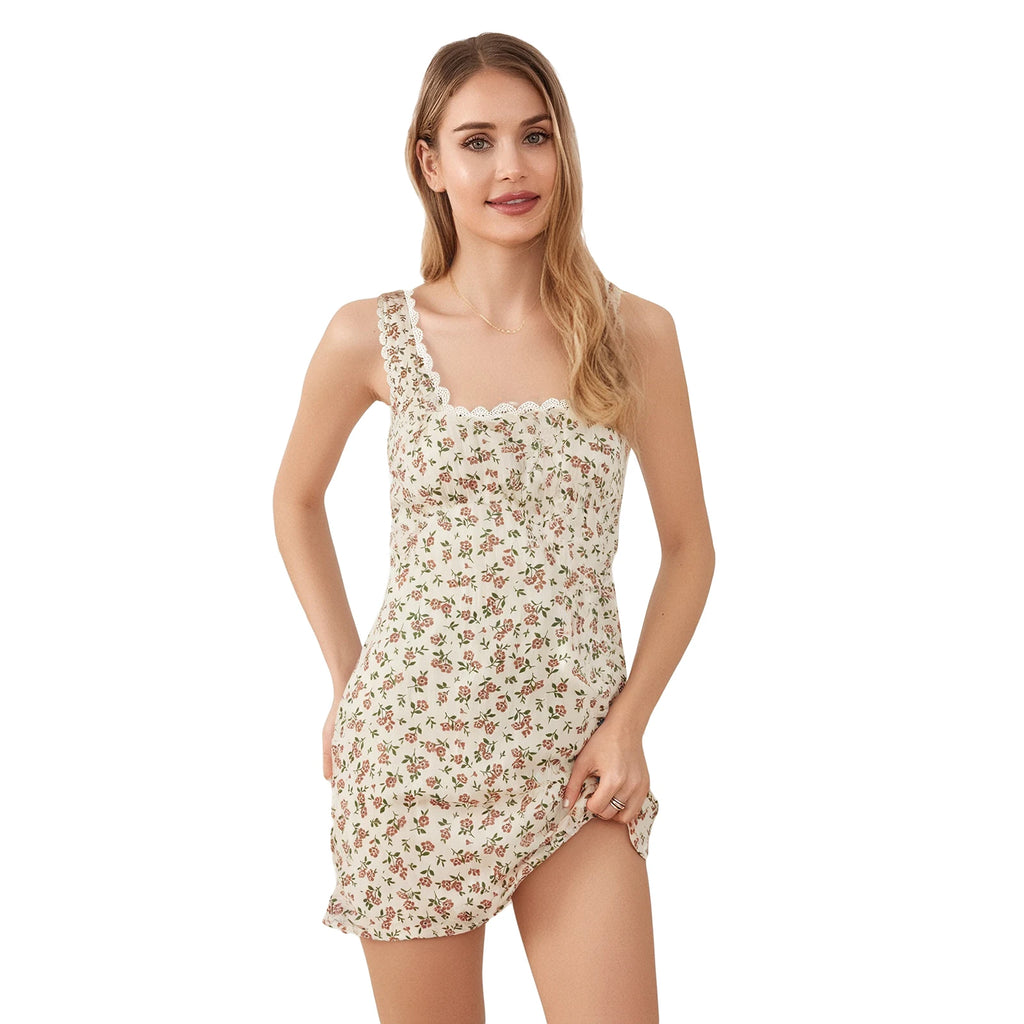 Womens Summer Tank Dress Sleeveless Square Neck Lace Trim Solid Color A-line Dress Short Mini DressFeatures: