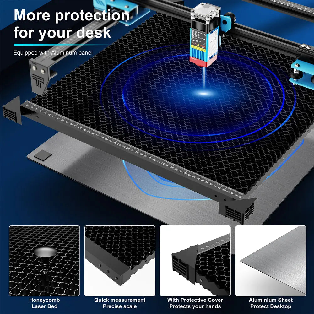 With this new version, we have added clear measurement marks on the edge of the laser bed. The measurement markings that make it real useful for placement. Also very handy for measuring materials for cutting and engraving projects.