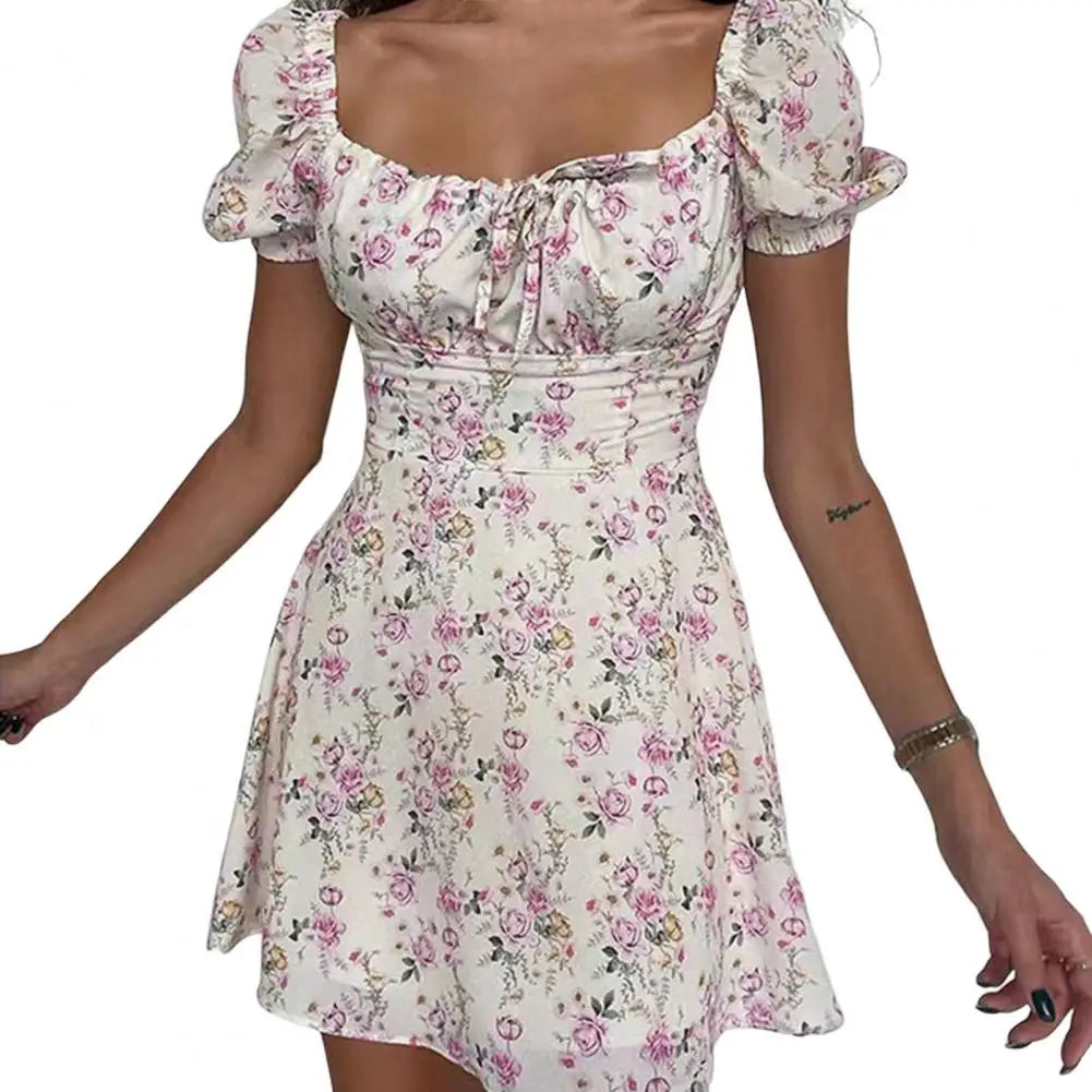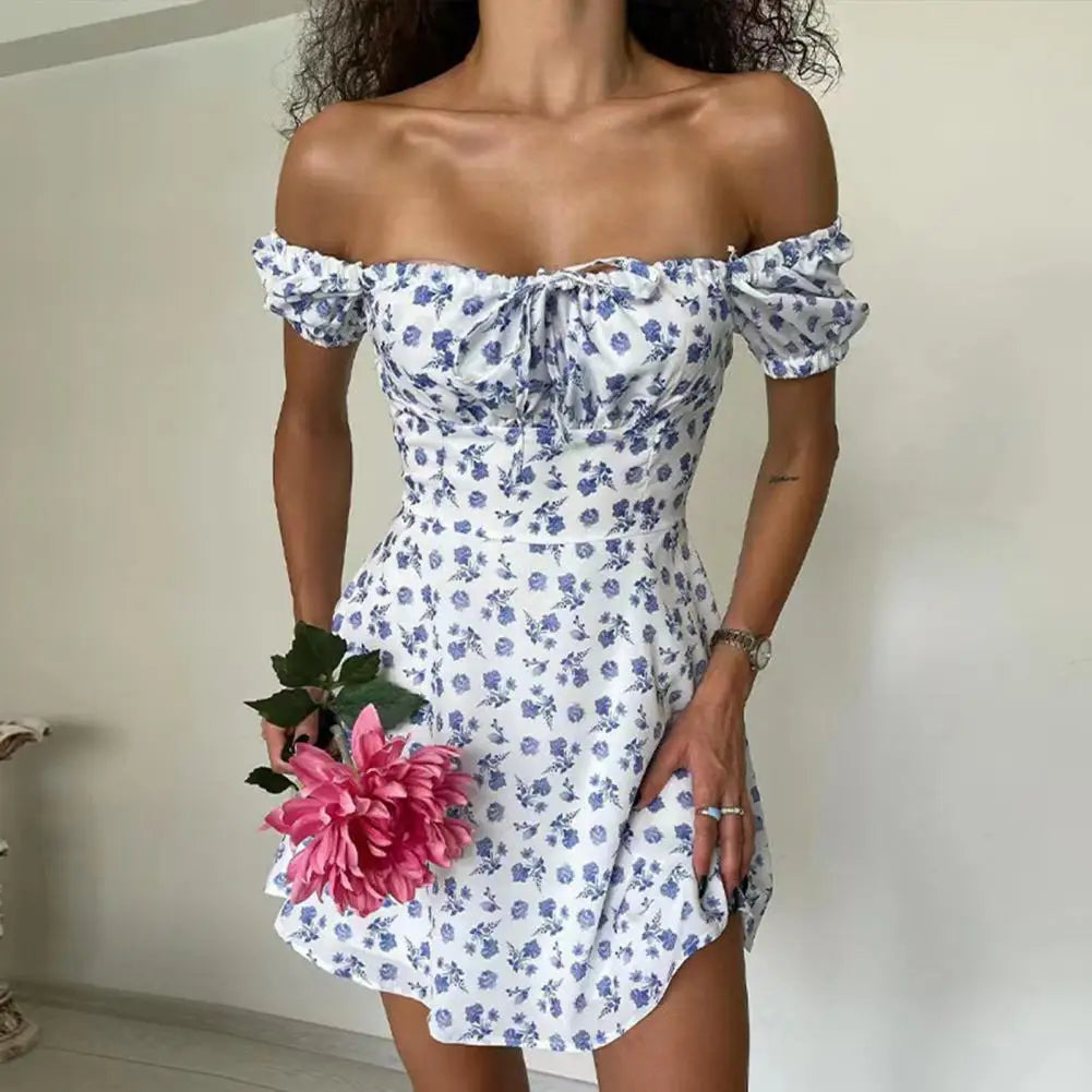 2024 New Summer Casual Off Shoulder Tie Up Floral Print A-Line Dress Sexy Women Short Sleeve Slim Mini Dress for Club Party