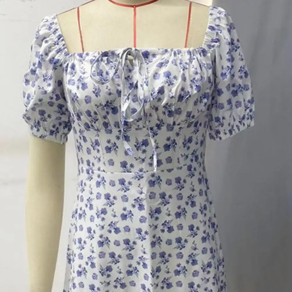 Women Dress Square Neck Elastic Vintage High Waist Pullover Refreshing Flower Print Off Shoulder Backless Summer Dress Female Clothing