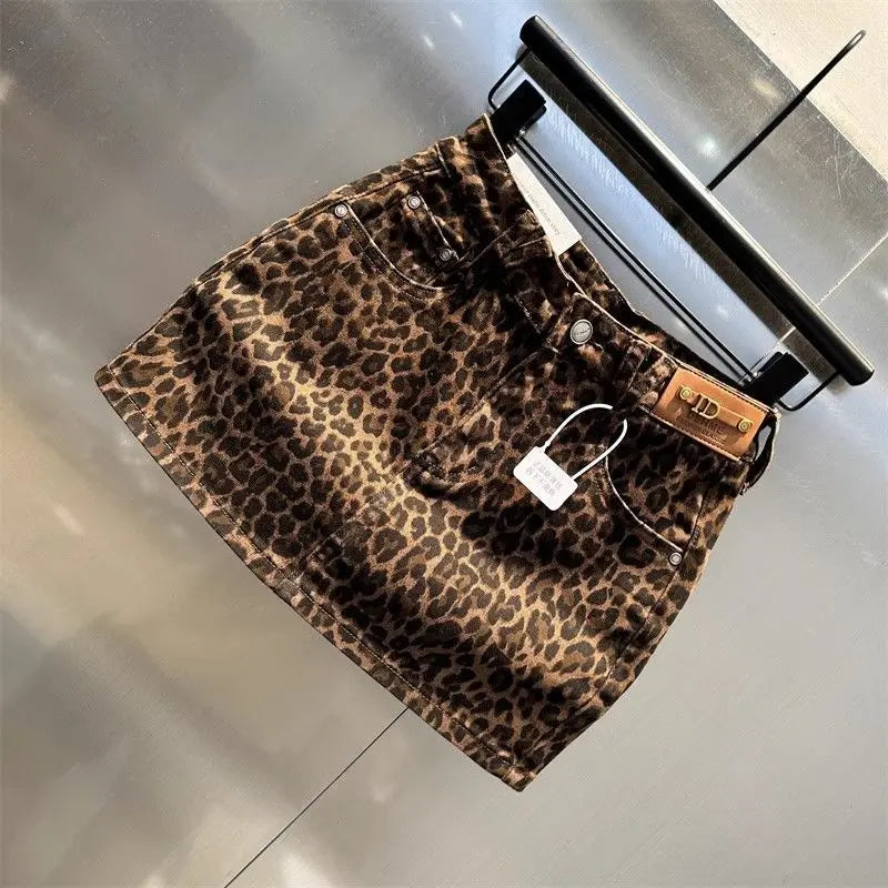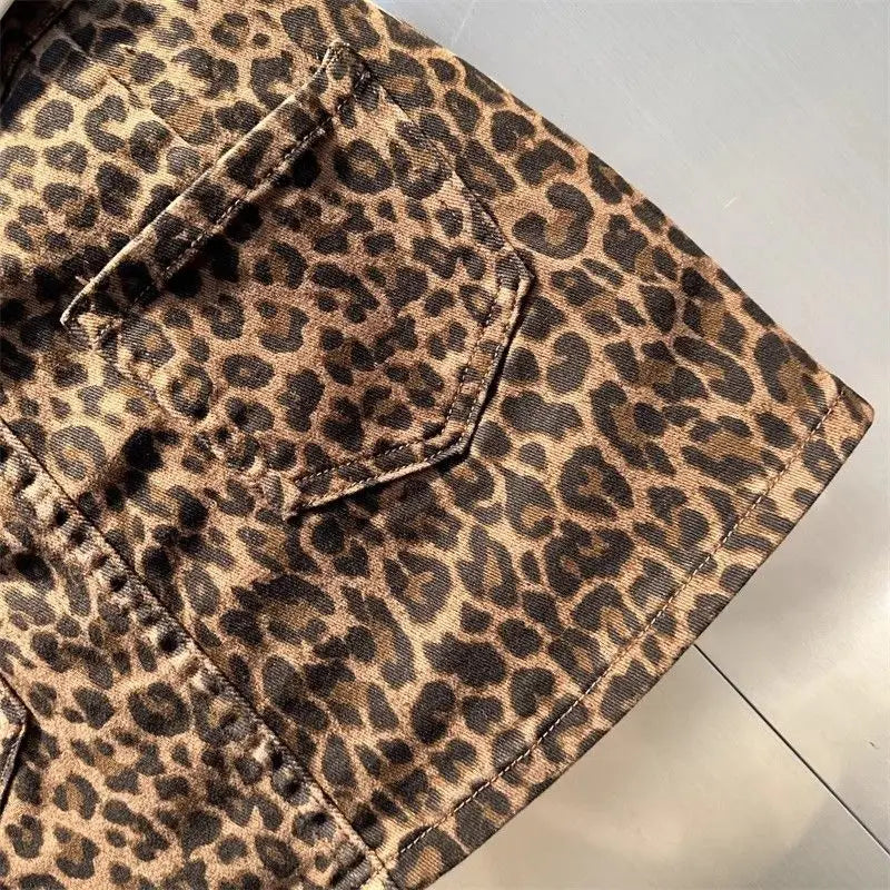 New short skirt 2025 summer American fashion elastic coffee leopard print denim hip skirt hot girl patch small short skirt