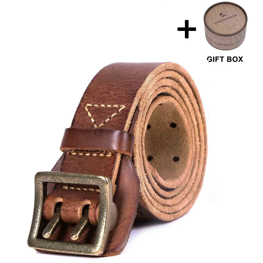 Vintage Genuine Leather Men's Belt With Copper Buckle, Handmade Casual Double Pin Buckle Belt With Gift Box, Thickened Top-layer