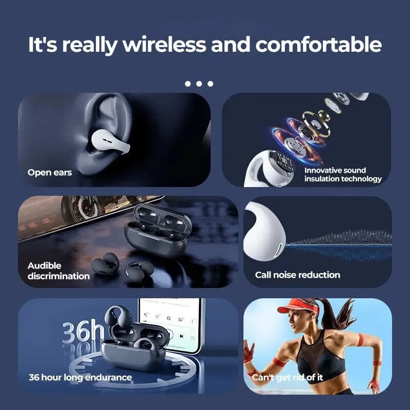 Wireless Bone Conduction Bluetooth Headphones with Charging Case, Clip on, Sports Headphones