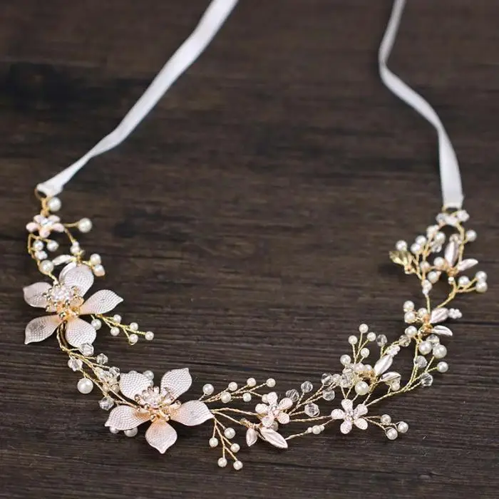 Floral Headbands For Women Golden Leaf Wired Crystal Pearls Flower Hairband Wedding Crown Hair Vine Bridal Hair accessories VL
