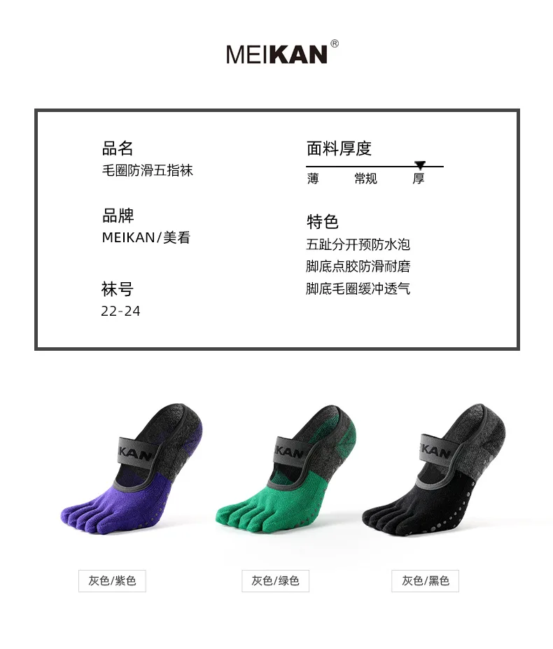 Marke: MEIKAN Name: Rutschfeste Fünf-Finger-Yoga-Socken Material: 95 % gekämmte Baumwolle, 2,1 % Spandex, 2,9 % andere Fasern) Dicke: Frottee-Unterseite Nackte Socken Gewicht: ca. 36,5 g/Paar Farbe: wie abgebildet (schwarz, grün , Lila) Größe: M (EU35-38,US5-6.5,UK4-5.5,geeignet für 22cm-24cm)