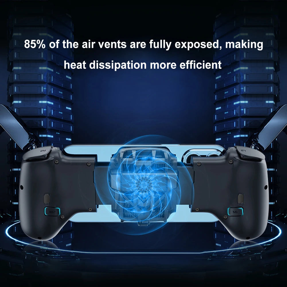 Feature: 1. Platform Compatibility: The telescopic gamepad supports multiple platform modes including for Android HID mode, for Android mapping mode, for iOS mapping mode,for iOS MFI mode, for Switch mode, and PC mode, offering versatility and compatibility across various devices. 2. 2-in-1 Design: Combines semiconductor cooling and game controller functionalities in one device. The telescopic design of mobile phone controller ensures compatibility with mainstream smartphones, and it can be paired with the Moowii Gaming mapping software for customizable button settings. 3. Responsive Spring Triggers: The triggers of wireless mobile gaming controller feature a spring structure, providing comfortable pressing and instant response without any lag. Enjoy a satisfying tactile feedback while gaming. 4. Precise Dual Joystick Control: The keycaps of phone game controller are designed with anti-slip textures to prevent drifting and ensure precise movement during gameplay. Experience accurate and smooth control. 5. Excellent Heat Dissipation: Equipped with a 7-blade fan on the back, this cell phone gamepad joystick provides effective heat dissipation for your smartphone, keeping it cool during intense gaming sessions. The vibrant LED lighting further enhances the gaming atmosphere. Specification: Origin: Mainland China Compatible Brand/Model: None Trigger Button Type: NONE Colour: Black Material: Plastic Hardware Semiconductors Electronics Silicone Power: 6W Input Interface: TYPE-C USB Clamping size: 136-184mm Clamping thickness: 15mm Input Voltage: 5V Input Current: 2A Rated Input: 5V 2A Battery: 300mah Product size: 214.5*94.5*57mm 8.44x3.72x2.24inch Package Size: 237*123*64mm Gross weight: 150g Note: ![]() 1 x Telescopic Gamepad
