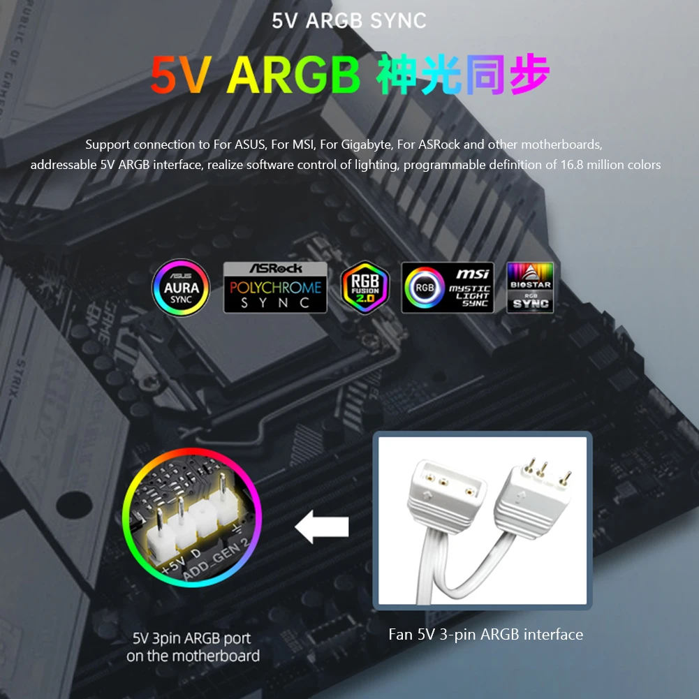 1. Glow inside and out, true color ARGB: Using 24pcs long-life ARGB lamp beads, it supports 16.8 million color full-color display, the color is gorgeous, soft and full, and no lamp beads are leaked. 5V 3 Pin ARGB, Aura sync. Support connection to for ASUS / MSI / Gigabyte / ASRock and other motherboards, addressable 5V ARGB interface, software-controlled lighting, and programmable definition of 16.8 million colors.