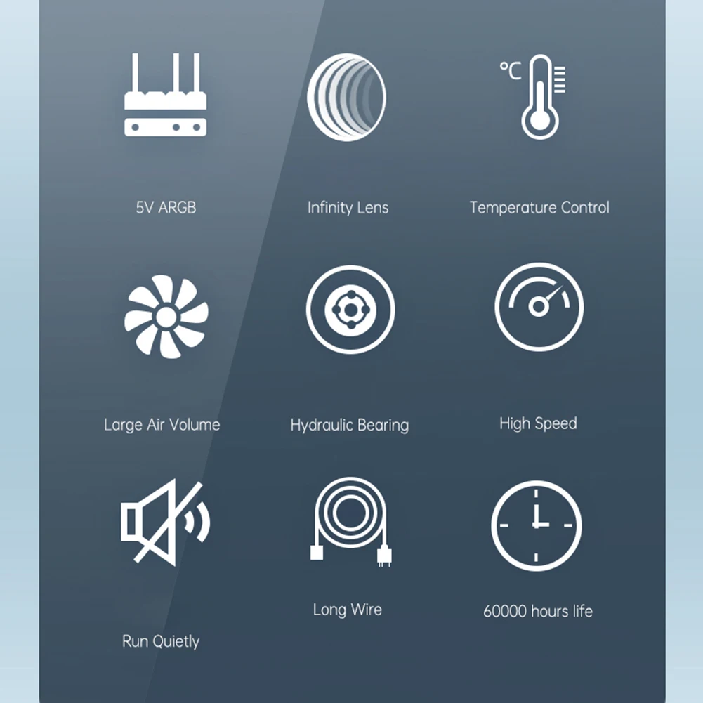 2. Infinity lens, deep and quiet: The shaft of the WF1 fan is designed with a lens, which creates an infinite loop of layers and shocks your vision. Hydraulic bearing, high speed, long enough wire, service life up to 60000 h.