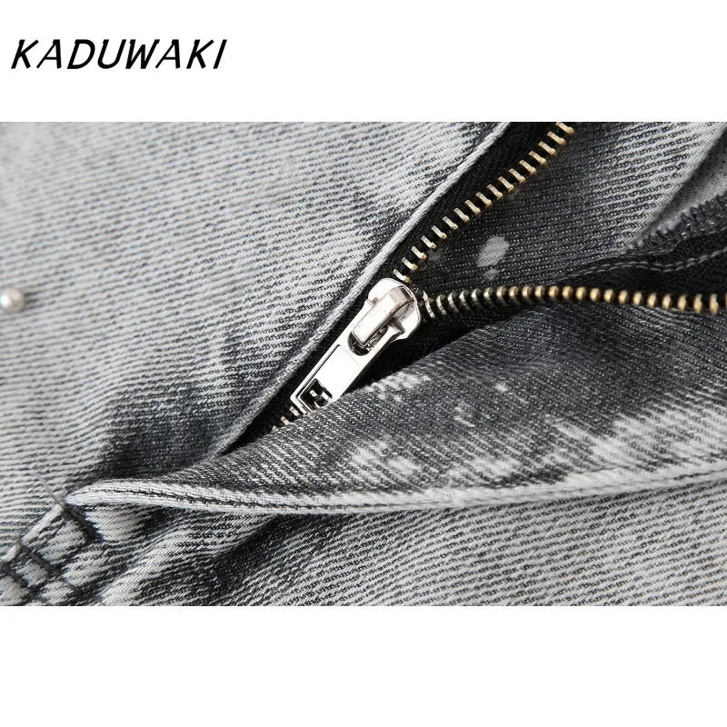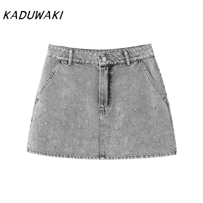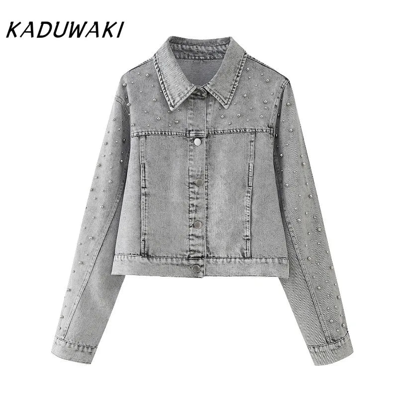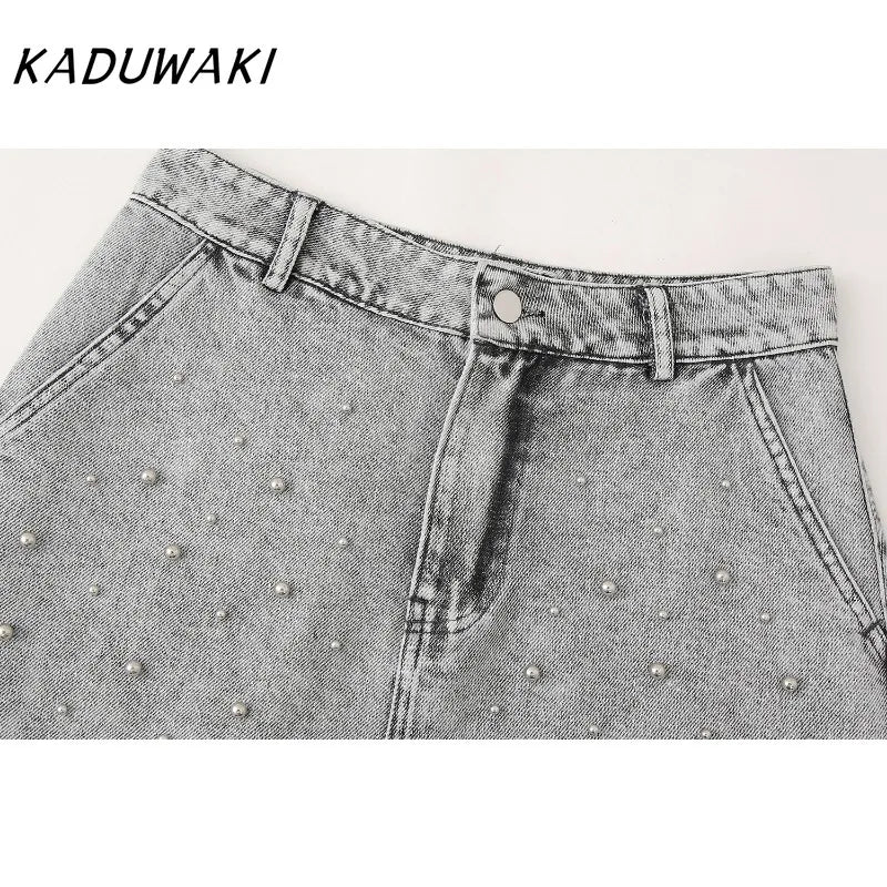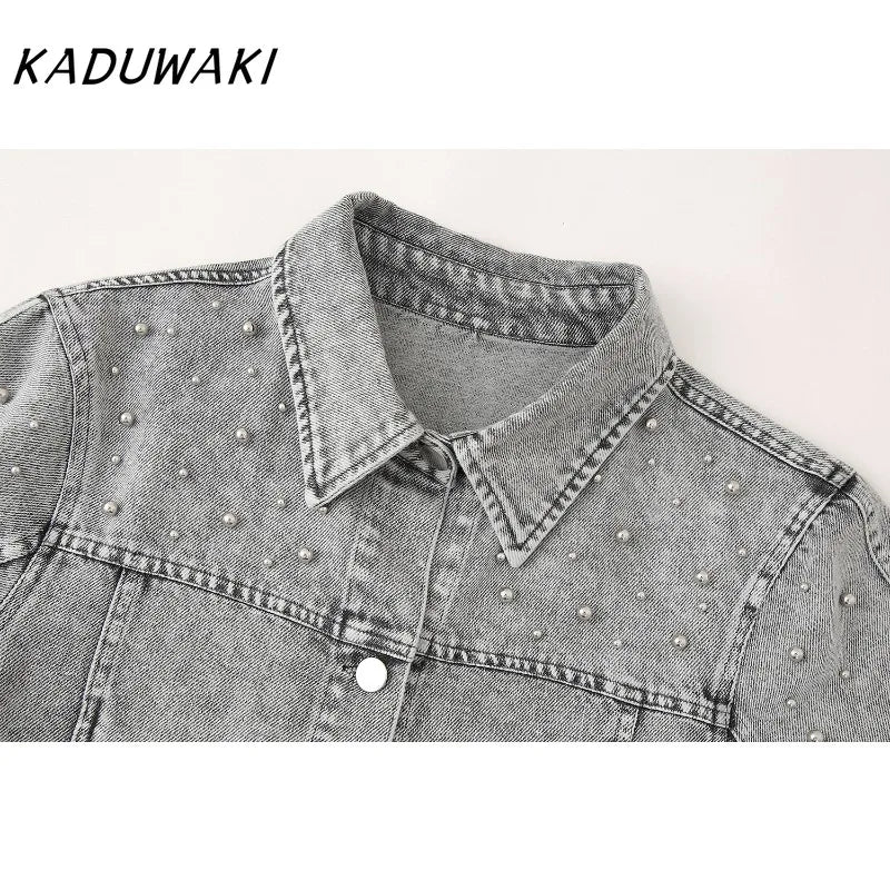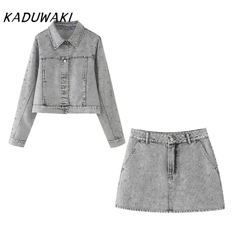 KADUWAKI Chic Able Faux Pearl Embellished Women's Short Denim Jacket 2-piece Set Retro Women's Elegant Zipper A-Line Mini Skirt