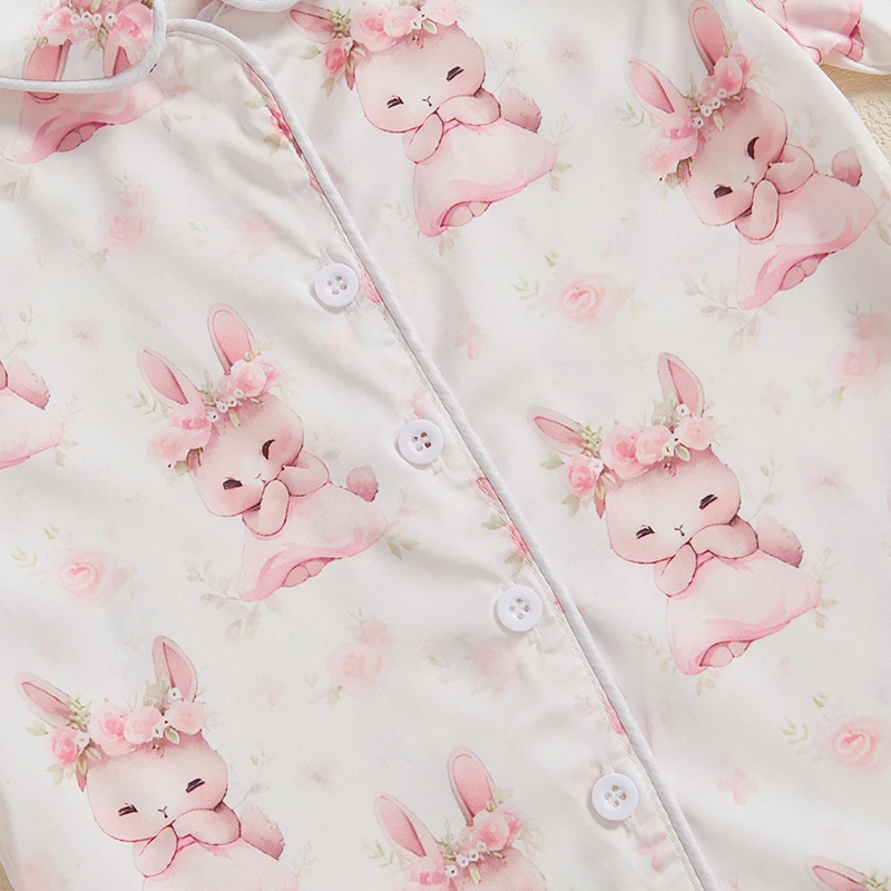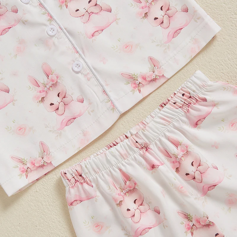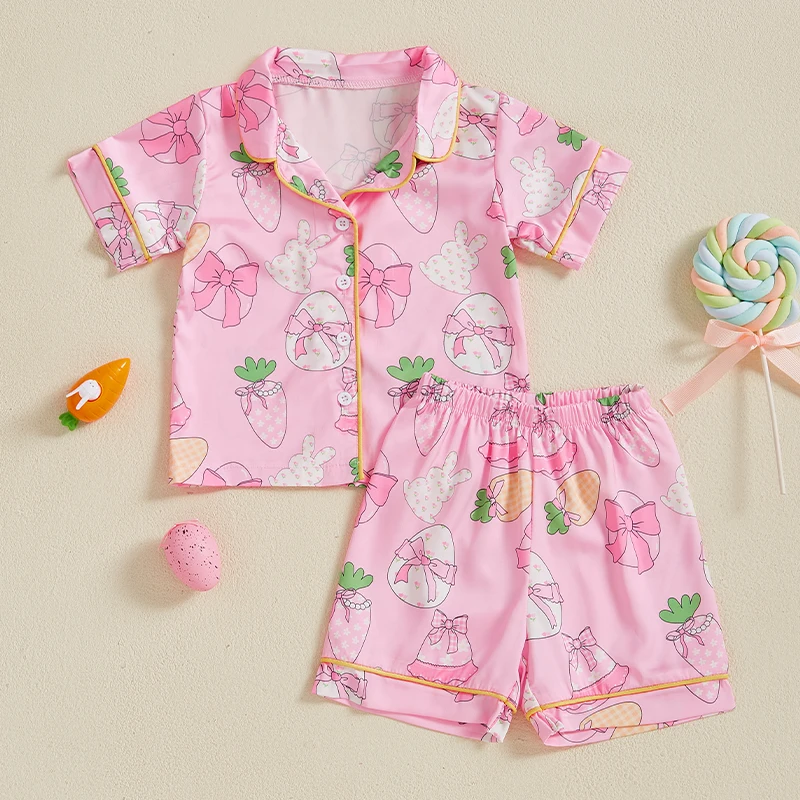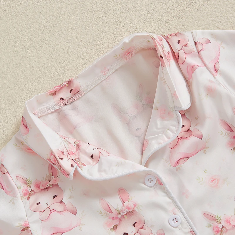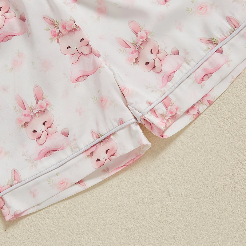 Boy Girl Easter Satin Pajamas Set Bunny Print Short Sleeve Lapel Button Down Tops with Shorts Sleepwear