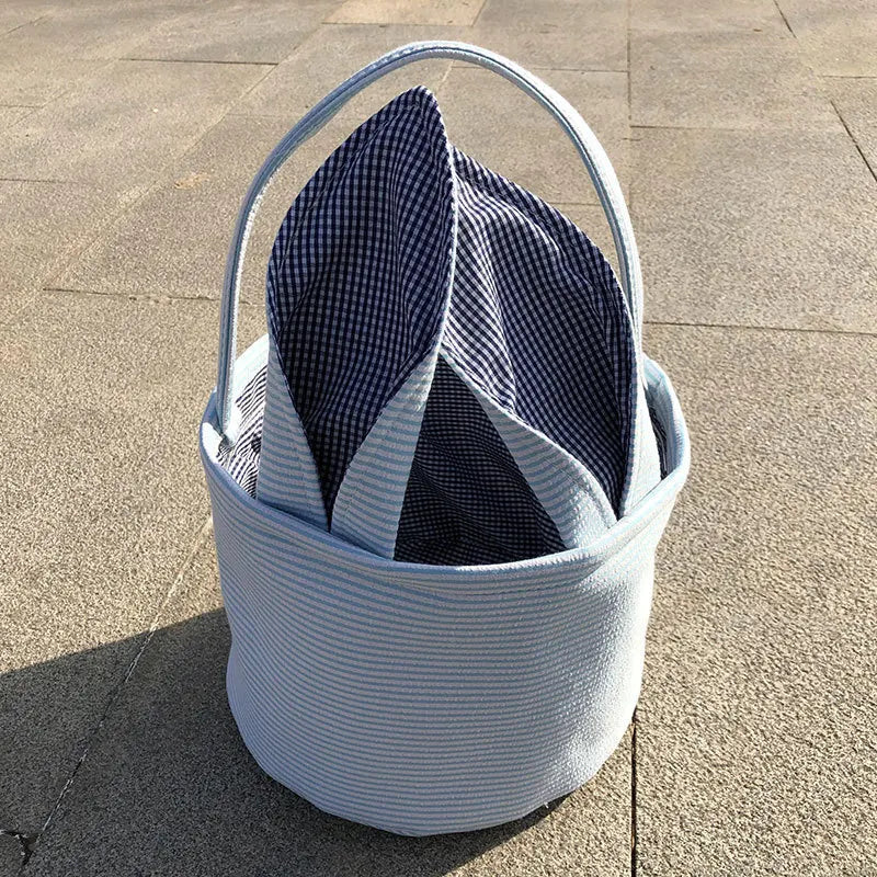 Personalized Seersucker Easter Basket with Gingham Floppy Bunny Ears, Embroidered Canvas Seersucker Easter Baskets for Kids Gift