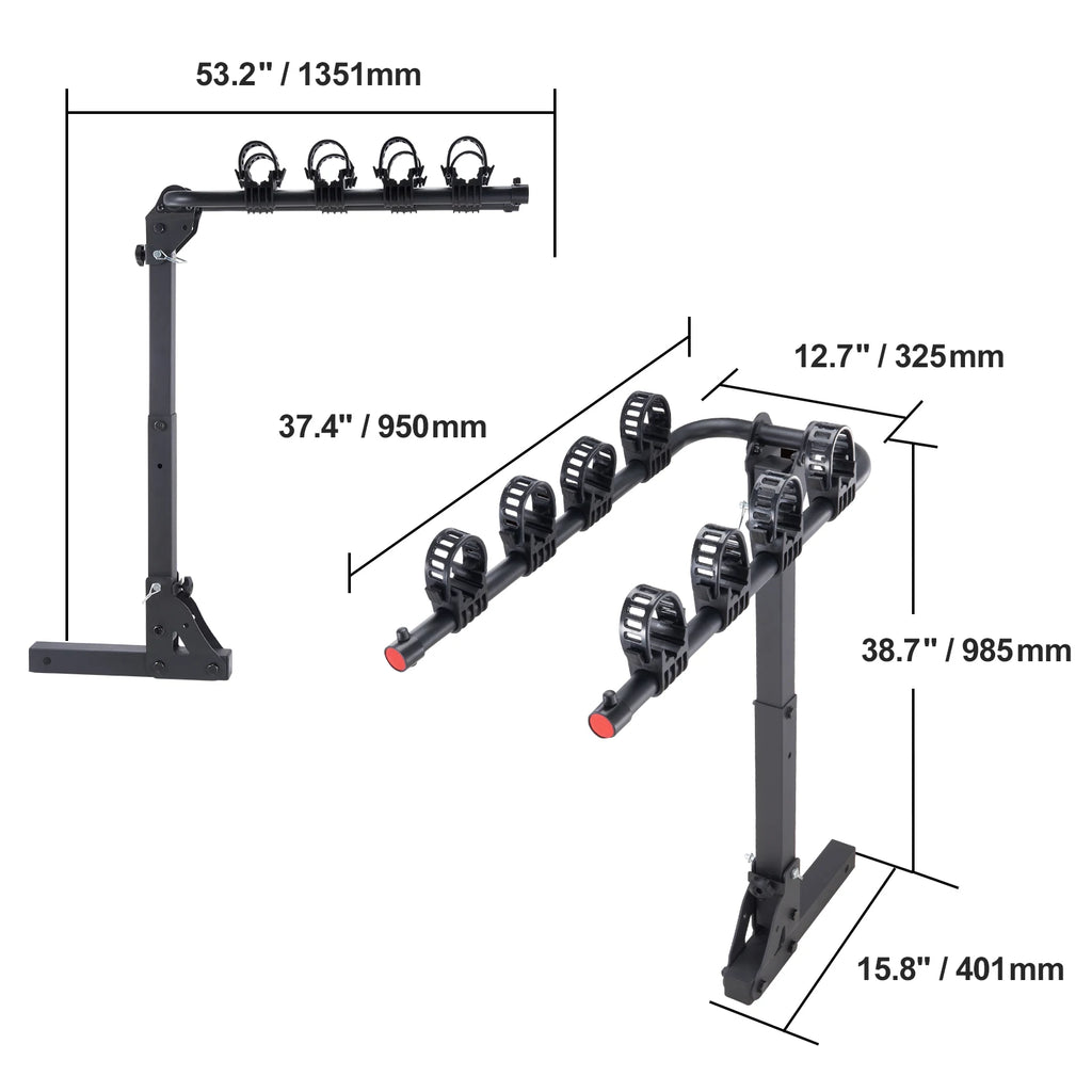 Easy Access with Tilting & Folding Design: Access your trunk easily with the tilting feature, which lets you open the rear hatch without removing the rack. Plus, the folding design allows for convenient storage when not in use, saving space in your garage or vehicle. High Weight Capacity: This hitch bike rack supports up to 80 lbs in total, with each bike carrying up to 40 lbs. It’s perfect for heavier bikes and accommodates tire widths up to 2.4 inches, making it suitable for a wide range of bicycles. Securely Fasten Your Bike: The included soft-cushioned hooks and straps ensure your bikes stay firmly attached to the rack while protecting their finish. The straps prevent any rubbing or damage, keeping your bikes secure even on long, bumpy rides. Safe and Stable Transport: Equipped with an anti-wobble device and safety latch, this bike rack minimizes movement during transport. It ensures a smooth ride by securely holding your bikes in place, even on rough roads or at high speeds. Universal Vehicle Compatibility: This rack fits most vehicles with 1.25” or 2” hitch receivers, including small to medium-sized cars, SUVs, trucks, and RVs. It provides ample clearance with its 26.7-inch connection pipe, ideal for vehicles with rear-mounted spare tires.