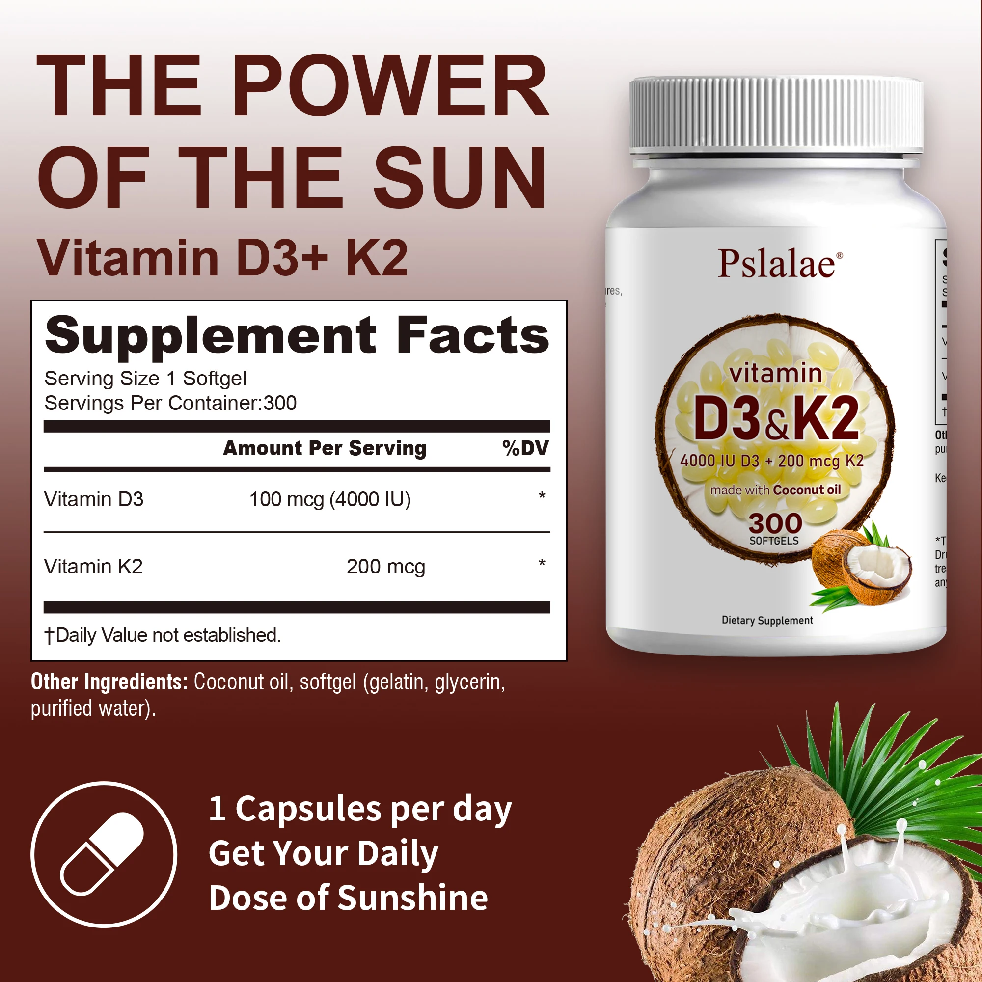 Each bottle provides 300 easy-to-eat coconut oil softgels. A powerful, one-a-day complex that delivers the synergistic effects of nature's sunshine vitamins. Each dose contains 10,000 IU of Vitamin D3 and 200 mcg of Vitamin K2.