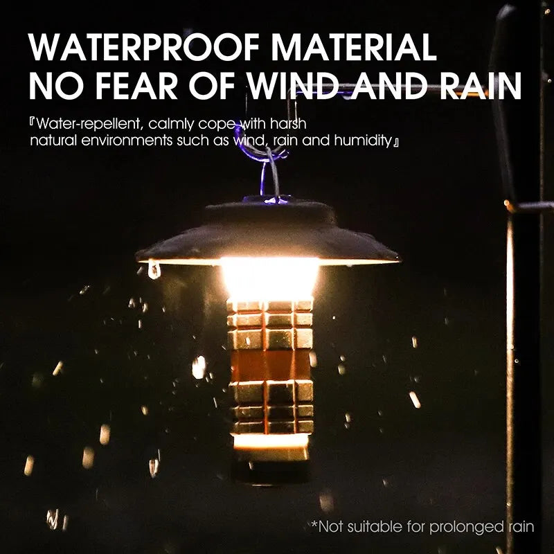 NOTED:This camping lantern is made of waterproof material and is not afraid of daily wind and rain. However, please avoid leaving the camping lantern exposed to rain for a long time, otherwise the product may be damaged.