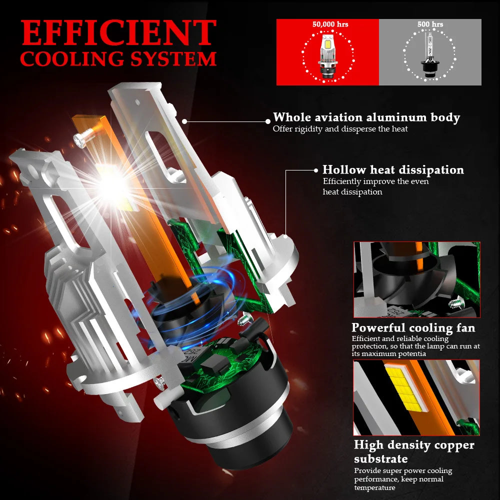 3, Upgrade Cooling System: B4A LED Headlight has a durable aluminum body, built-in more powerful high-speed cooling fan, intelligent and efficient cooling capacity, ensuring ultra-low temperature, and a life of up to 30,000 hours.