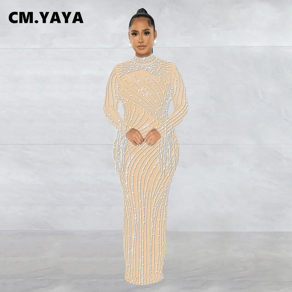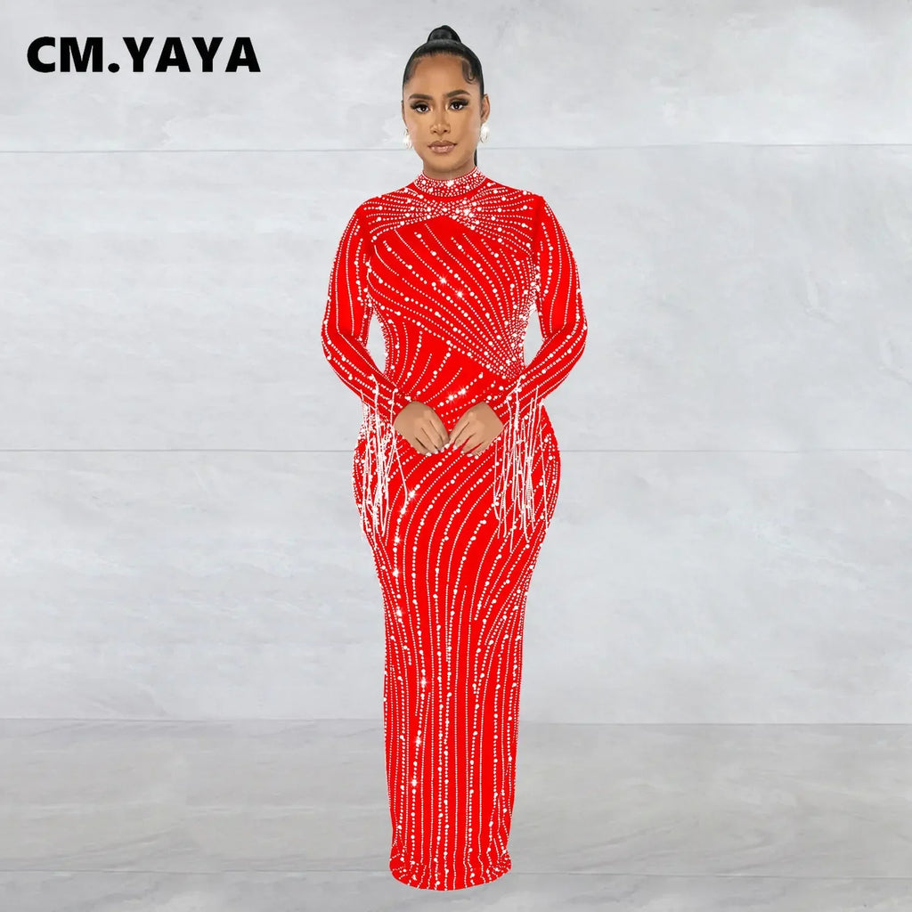 CM.YAYA Women Mesh Tassel Long Sleeve Diamonds Hot Rhinestones Bodycon Midi Maxi Long Dress and Tank Inner Dresses 2piece Suit