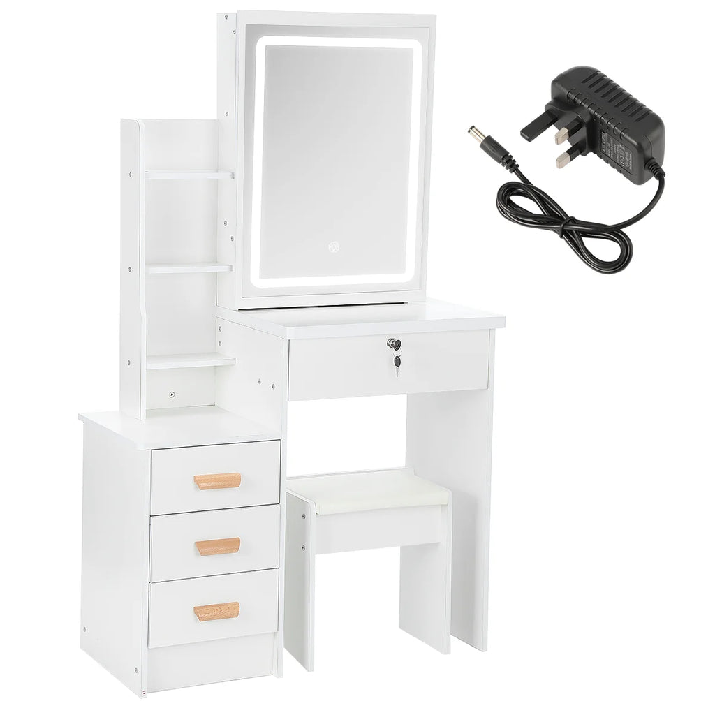 Dressing Table with LED Lights and Adjustable Brightness, Vanity Desk with Mirror, 4 Drawers, 6 Hidden Shelves, and Stool