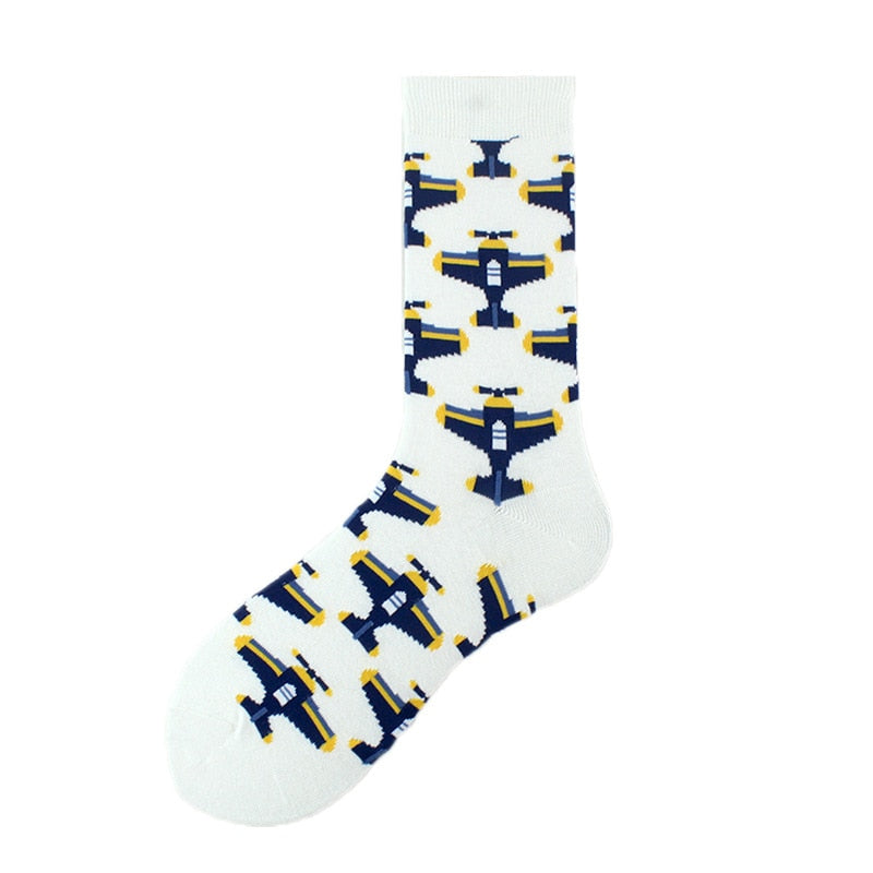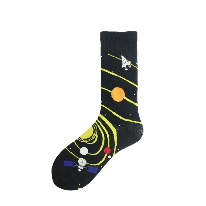 Happy Funny Unisex Painting UFO Astronaut Outer Space Rocket Star War Men Crew Socks Streetwear Cotton Male Skateboard Dress