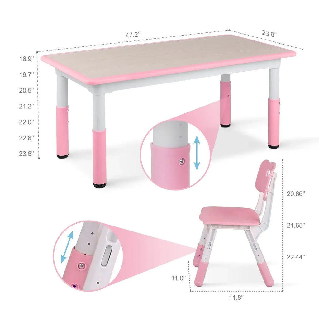 The adjustable painting table and chair set for children is made of high-quality HDPE and PVC materials. Passed CPC certification, is a professional children's furniture. The children's desk and chair set consists of a table and four chairs, both adjustable in height. It is suitable for children of different ages to use on different occasions. The table board can be used for creating children's graffiti art, allowing children to paint freely with water-based makers. It is easy to wipe with a damp cloth, practical and beautiful, very suitable for parent-child families. Beam reinforcement design that makes the table larger. The legs have an adjustable table spinner that is suitable for different types of floors. The children's table and chair set is safe and reliable, and the design is exquisite. Our children's placemat is the best choice for you and your children.