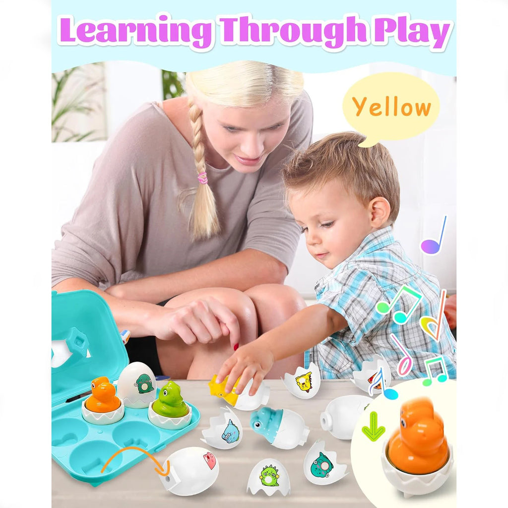 ✨[Montessori Toy for 1 2 3 Year Old] : Dinosaur matching eggs contain 6 colored eggs with 6 different shapes at the bottom, which requires our children to place the eggs into their own special base by recognizing the shapes and colors. It is designed to develop kids mind, exercise fine motor skills, and improve hand-eye coordination and problem solving. With a total of 6 different colored dinosaurs, they chirp when you gently press their heads, so this is a fun way to develop your child's senses and motor skills.