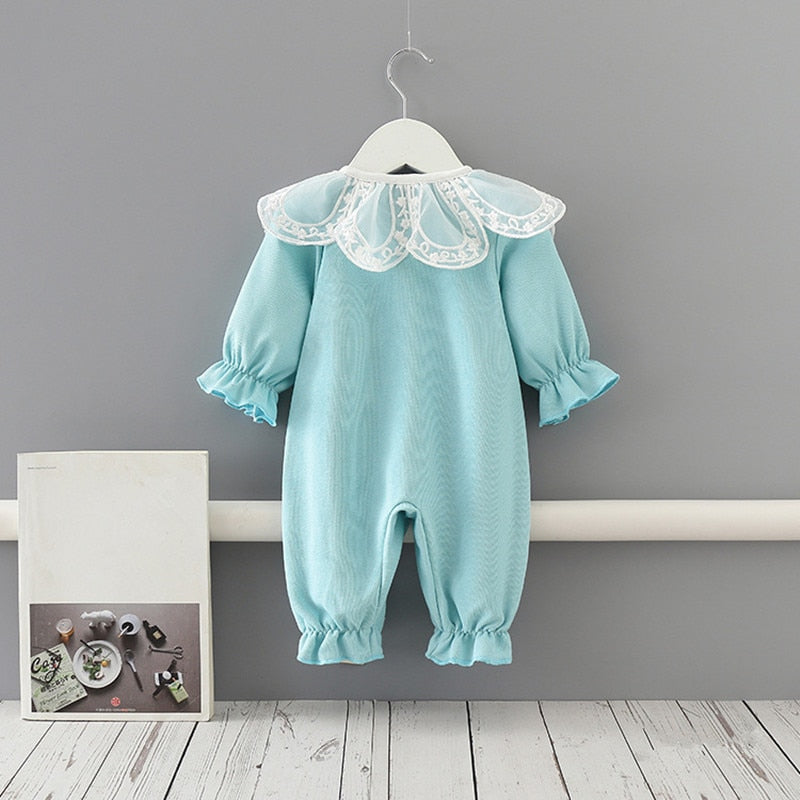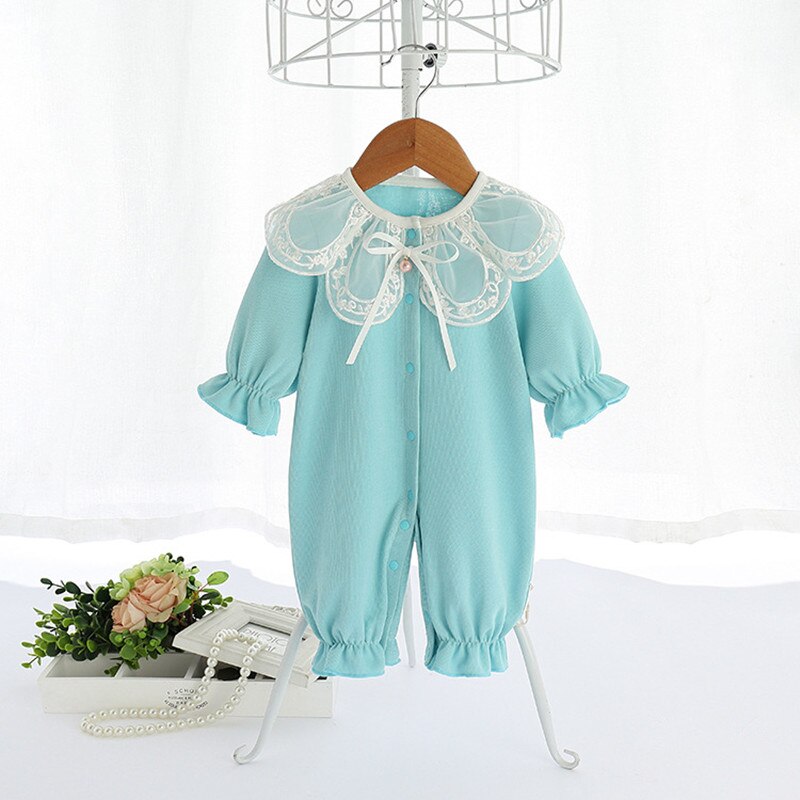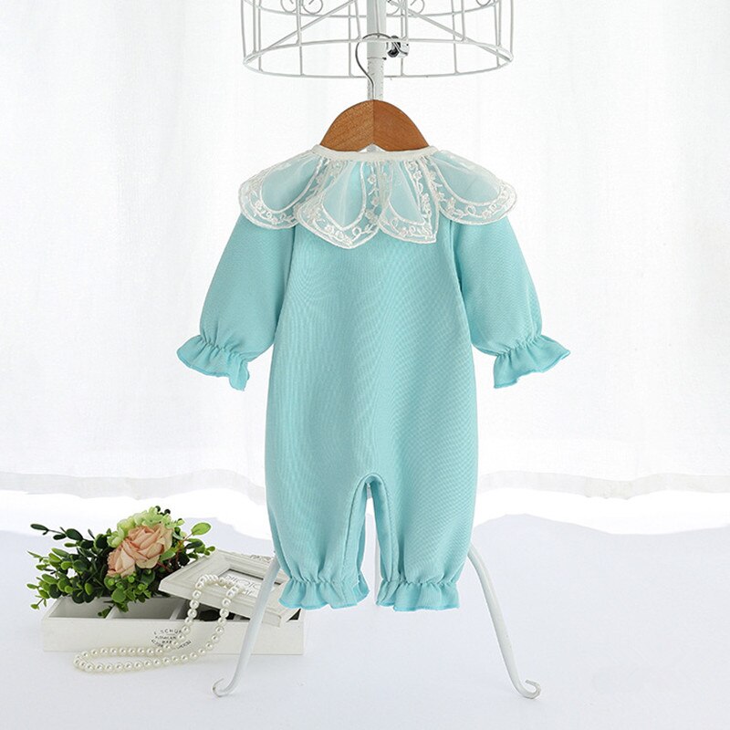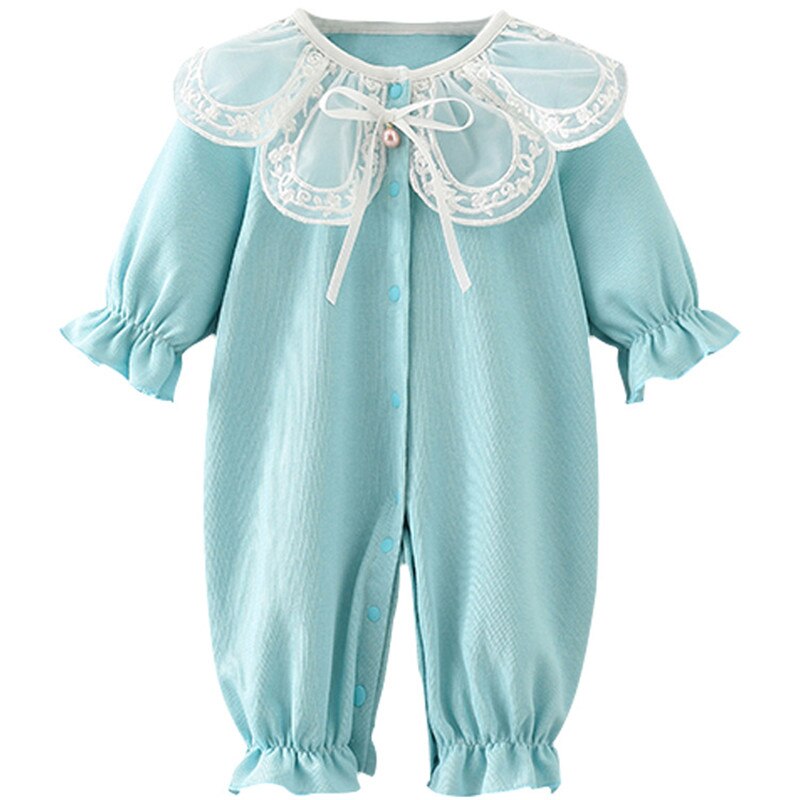 Neugeborenes Kleinkind-Säuglingsbaby-Spielanzug-Spitzen-Kragen-Overall-Spielanzug-kleine Mädchen-Ausstattungs-Baby-Kleidung-Blau 0-2T