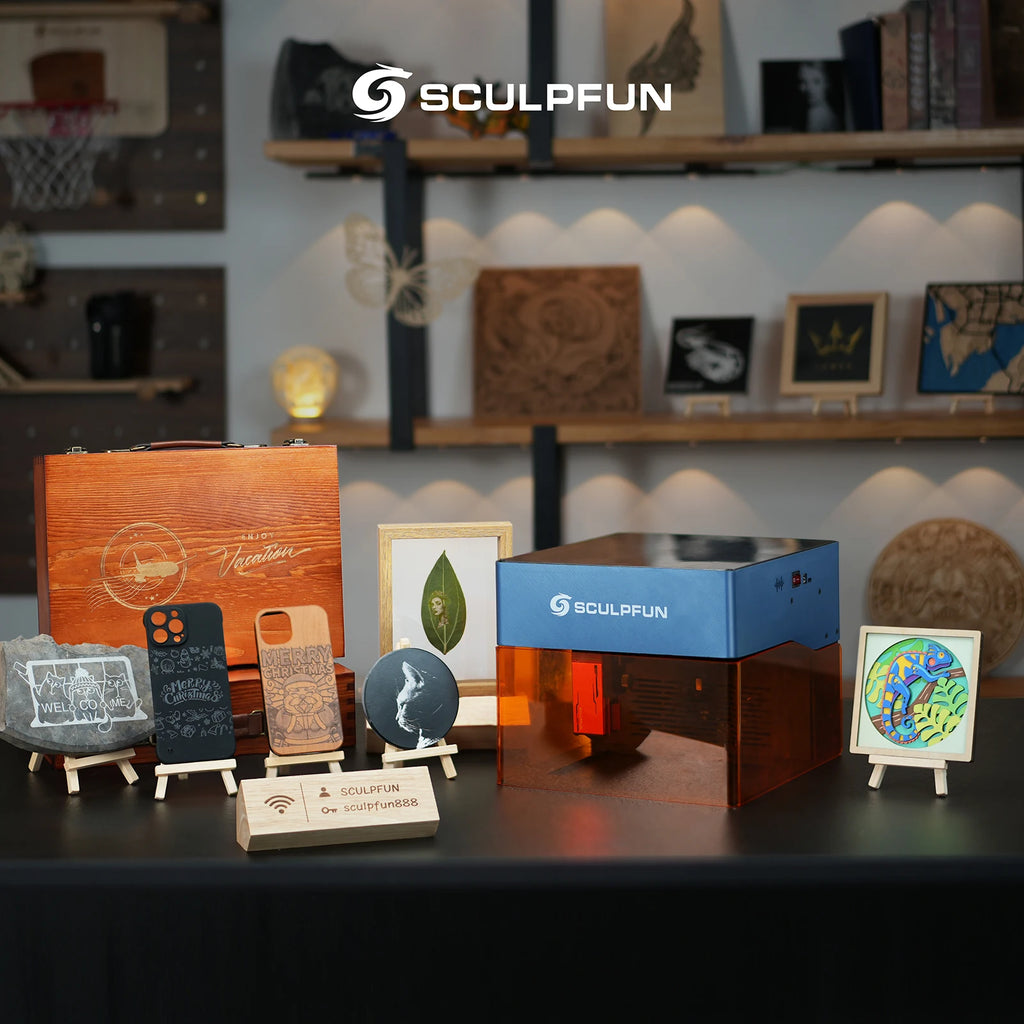 ♦ With Smoke Filter: Sculpfun iCube laser engraver is equipped with the smoke filtration system that effectively filters the smoke generated during the engraving and cutting process without the enclosure, which makes it more convenient to engrave and cut in an office or home. Bringing more usage scenarios and enjoying the fun of engraving without limitation.