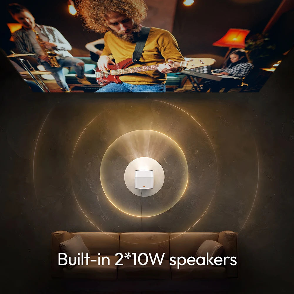 Built-in dual audio and subwoofer system projector to bring shocking stereo surround sound, two high-fidelity speakers to ensure balanced sound diffusion, with professionally tuned low-frequency unit, not only can clearly restore the details of the dialogue, but also present a deep and powerful explosions and music effects, without the need for external audio to enjoy an immersive audio and video experience comparable to that of the theater.