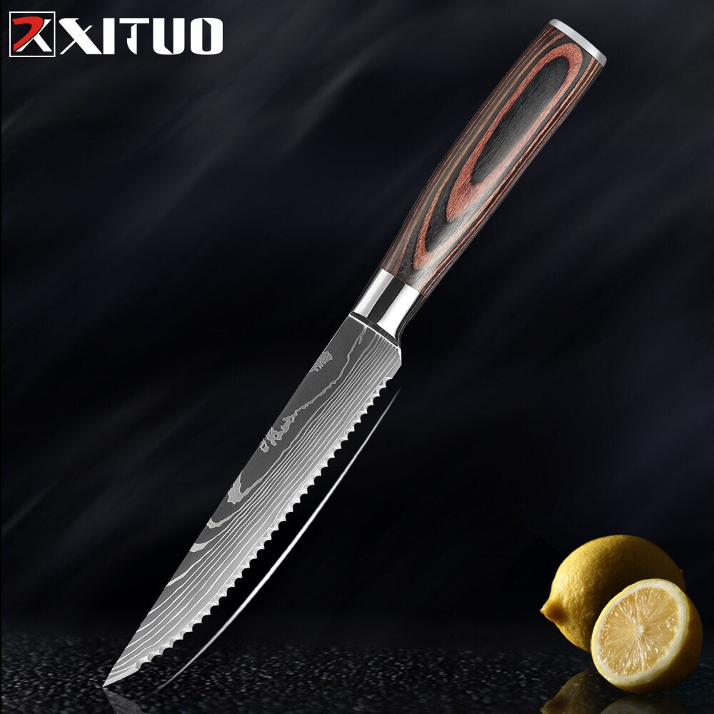 XITUO Steak Knife Set Damascus Pattern Stainless Steel Serrated Knife Beef Cleaver Multipurpose Restaurant Cutlery Table Knife