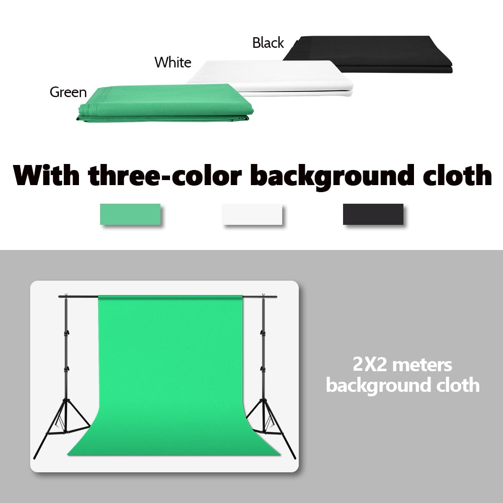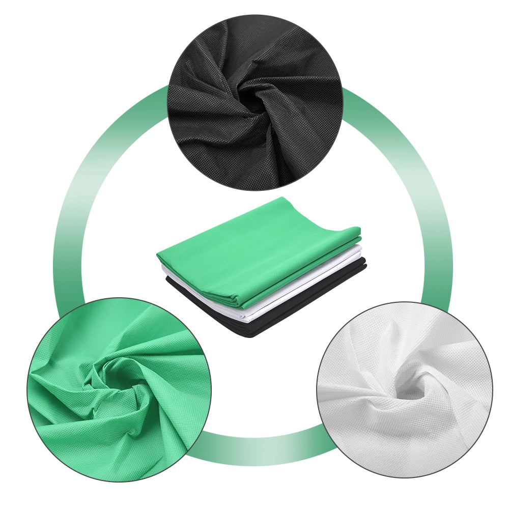 【Upgraded Backdrops】This kit comes with 3 x 1.6x3m Non woven Fabrics Backdrops( Black,White,Green ),The backdrop have been upgraded, It is non-reflective and easier to handle and maintain. Helps to bounce the light and helps brighten everything up. Can also help brighter colors, such as red and orange, stand out more. 【Adjustable Background Stand】This kit is a professional support with Adjustable Height( Min 2.3 ft – Max 6.6 ft ) and Width( Min 4 ft – Max 6.6 ft ). Made from aluminum alloy with a professional black stain finish. Can be assembled by one person in just a few minutes. The support stand also has universal 1/4" thread(spigot/stud), can be used as light stand, you can attach almost all light assemblies on it. 【Application】This product contains 4 kinds of background fabrics in common colors, suitable for various scenes (studio, family, wedding, party, portrait product photography, video production, etc.) to meet the different needs of customers. This product is a professional photographic background for photographers, but whether it is a novice or a professional photographer, the use of this product is very simple and convenient. 【Background Clips】This clamp has a sturdy grip with gentle,pivoting pads that adjust to the grip surface.Small teeth on the inner diameter hold muslin cloth or paper backdrops in place for photo work. It can hang paper/ plastic/non-woven backdrops and all kinds of photography. 【Requires Attention】Since we are transported after folding, the background cloth you receive will inevitably have creases. At this time, you only need to open the background cloth, suspend it, and let it stand a few days to remove the wrinkle; Can use a wet towel to wipe the creases and then use a book to press it for a while; Or roll the backdrop up and put it aside.**High temperature steam iron is not allow. Package: 1 x 1.6*3m Black Backdrop 1 x 1.6*3m White Backdrop 1 x 1.6*3m Green Backdrop 1 x 2m*2m Background Stand 1 x Carrying Bag for Background Support 3 x Clamps