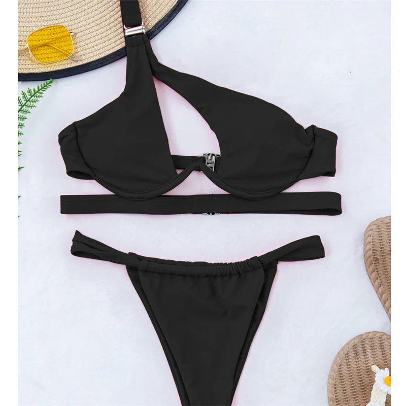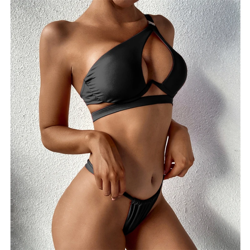 GNIM Sexy Hollow Out Swimwear Women Push Up Bikini Mujer 2021 One Shoulder Solid Thong Swimsuit Female 2 Piece Micro Bather Suit