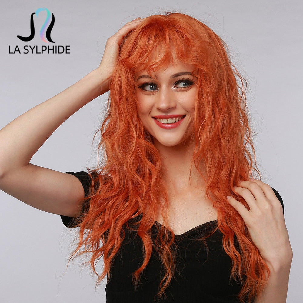 La Sylphide HalloWeen Cosplay Party Perücke Long Body Wave Orange Kunsthaar Perücken mit Pony für Damen Süße Perücken Hitzebeständig