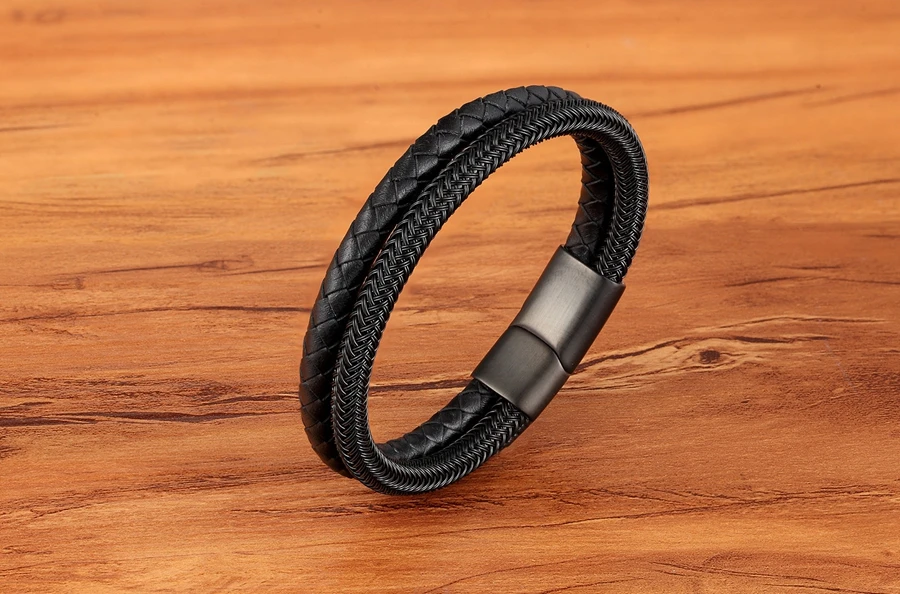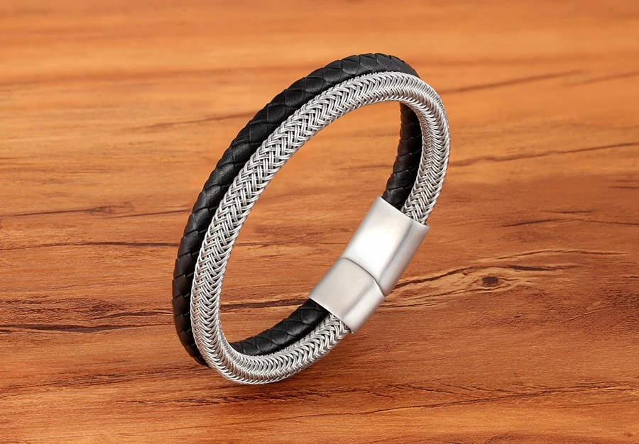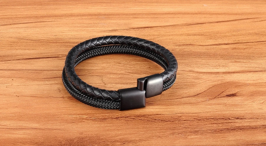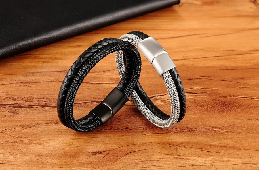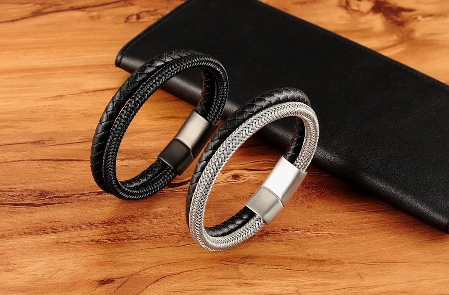 Name: stainless steel wire cable magnetic clasp double layered braided genuine leather chain bracelet