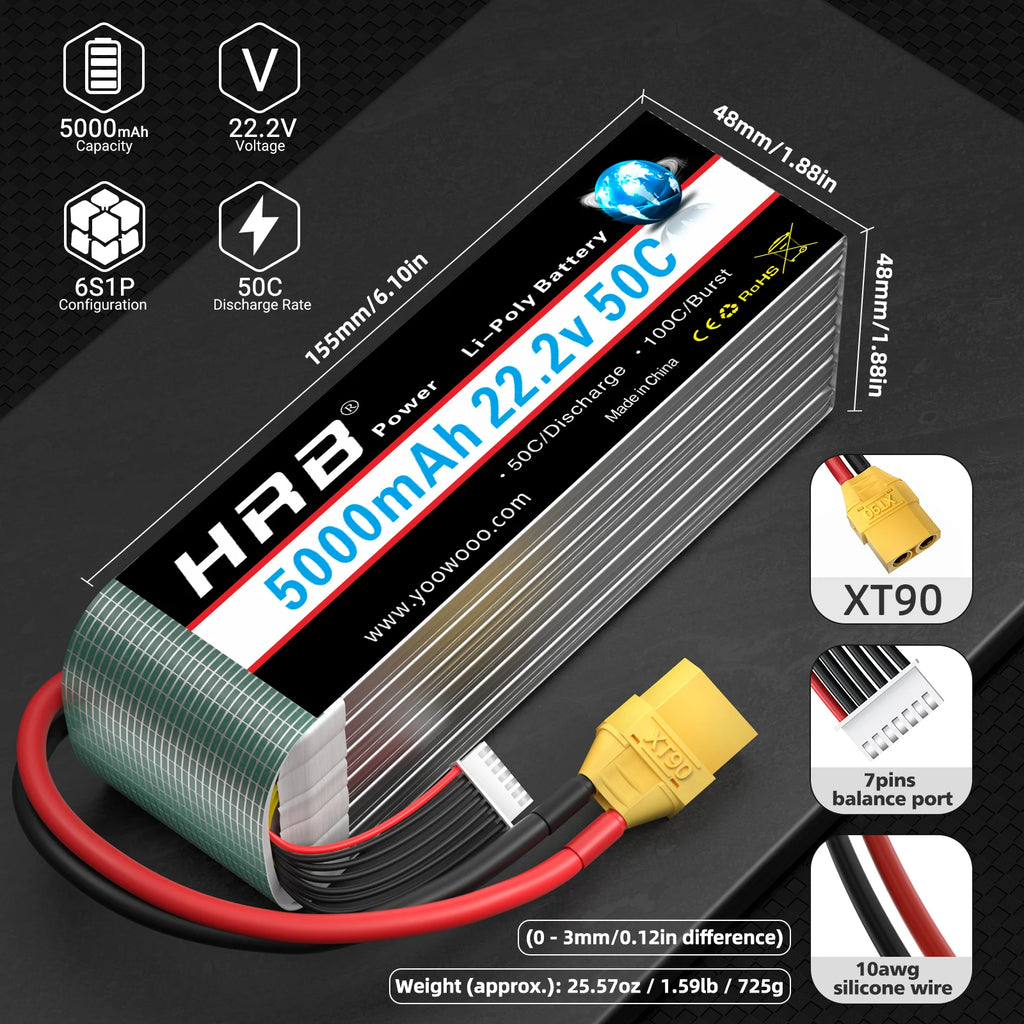 • HRB 6s 5000mah lipo battery , superior Lithium Polymer raw materials, up to 311Wh/kg energy density, long cycle life