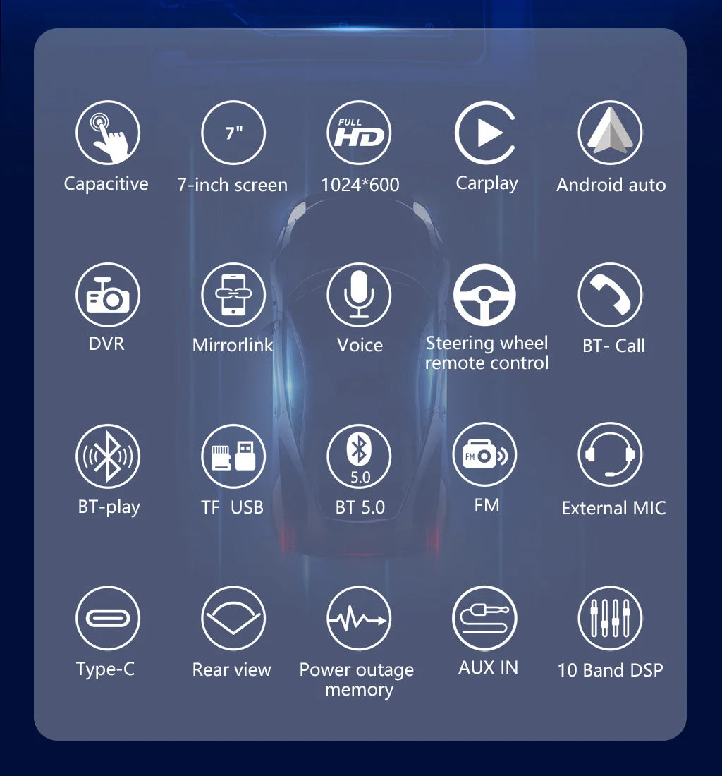 【7-Inch Double Din Touchscreen Car Stereo】7-inch 1024x600 HD capacitive screen designed. Universal double din standard size 7.0 inch×4.0 inch×2.4 inch,Installation size 100*178MM to fit most vehicles. Our double din stereo is equipped with a 7-inch HD capacitive touch screen and it makes more sensitive and accurate.