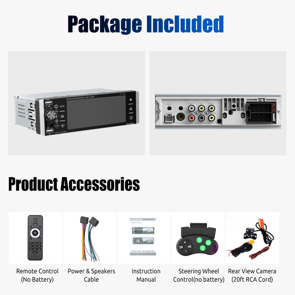 【1 DIN Car Radio】5.1 inch 2.5D IPS HD capacitive touch screen, touch display area, touch button area, sensitive operation. Fully compatible with current mainstream video formats, supports HD picture quality, front channel output perfectly restores sound quality and improves sound performance. This single din car stereo installation size: 188(L)*50(H)mm.