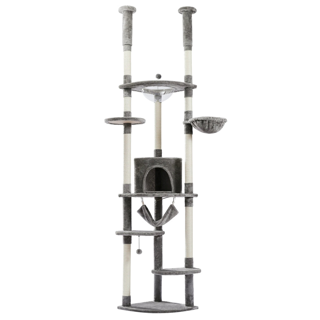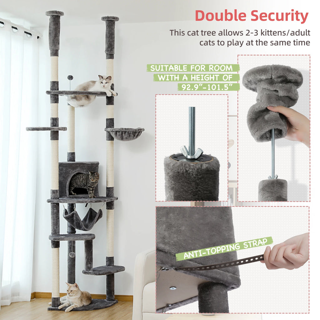 Floor to Ceiling Cat Tree Adjustable Cat Tower Tall Kitty Climbing Play House with Scratching Posts Cozy Condo Perches Hammock