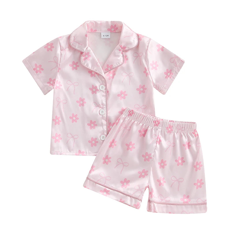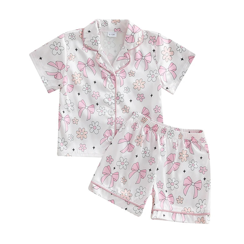 Toddler Girls Summer Pajamas Set Flower Bow Pattern Button Down V Neck Short Sleeve Tops and Shorts Lounge Wear 2 Pcs SetSize (cm)
