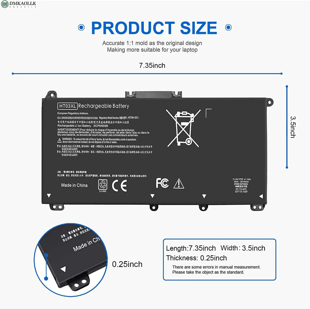 • Battery Model: HT03XL HTO3XL,Battery Type:Polymer. Voltage: 11.55V Capacity: 41.9WH ; Cells: 3-cell; Color: Black, Packages includes: 1x HT03XL battery , with two auxiliary installation tool and user manual;ht03xl for l11119-855 hp battery,for hp spare l11119-855 battery,for hp pavilion 15 battery replacement