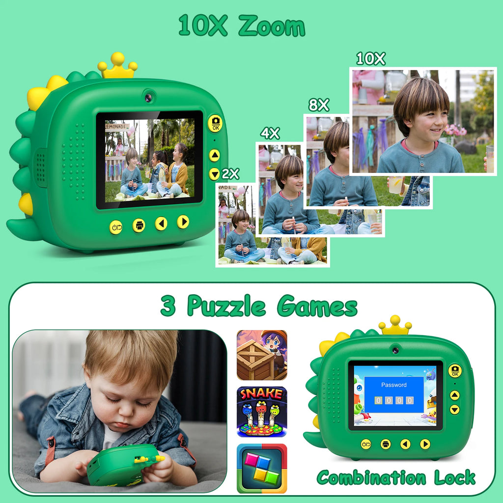 【20MP Dual Lens & 1080P HD Video】 This instant print camera for kids with dual lens that support selfie.It not only can capture 20MP photos and 1080P HD videos and playback, but also adjust Print density, self-timer function, burst recordings, 10x magnification zoom, cyclic recordings, 20 picture frames, 5 effects, 6 filters and a music player, 3 puzzle games, auto off, screen savers etc.