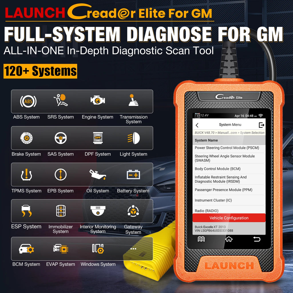 Professional automotive scan tool specially designed to diagnose electronic control systems of GM series vehicles which can read/erase codes, view live data, and retrieve ECU version information in all available vehicle systems including Engine,Transmission, ABS, SRS, TPMS, EPB,Body System,Battery,ESP, IMMO, etc.