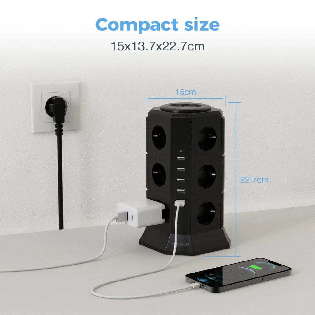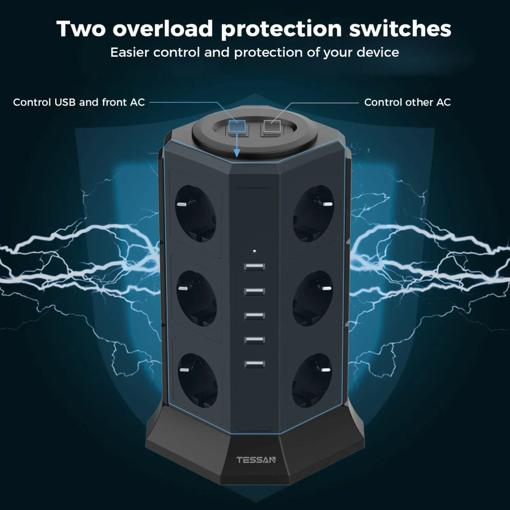 The multiple sockets 12 slots are distributed vertically on the 4 surfaces of the multiple plugs. The distribution socket offers enough space for each individual slot to save space and The 5 USB ports of the socket tower are an integrated Smart IC with a total current of 4.5 A. It can automatically detect your devices and delivers the fastest current possible, up to 2.4A per port.