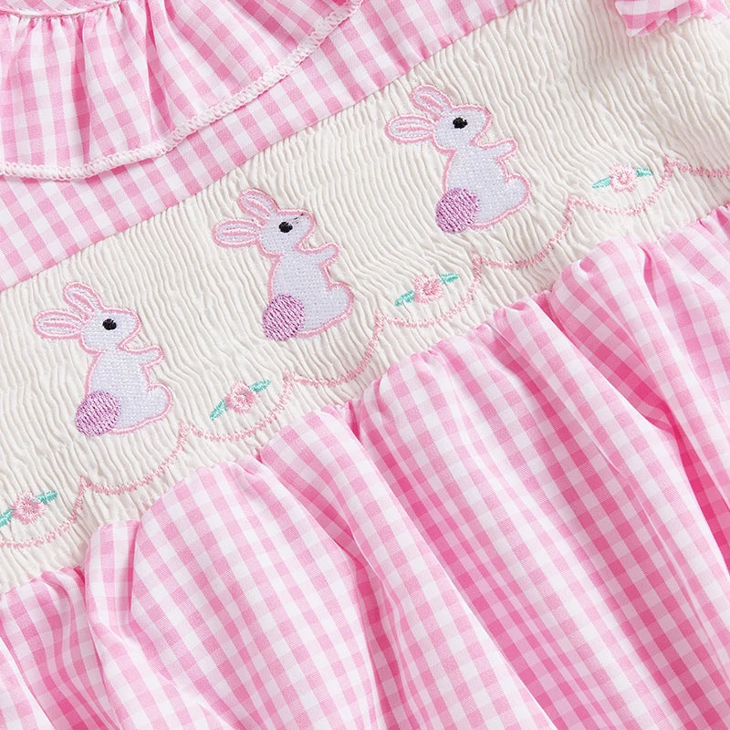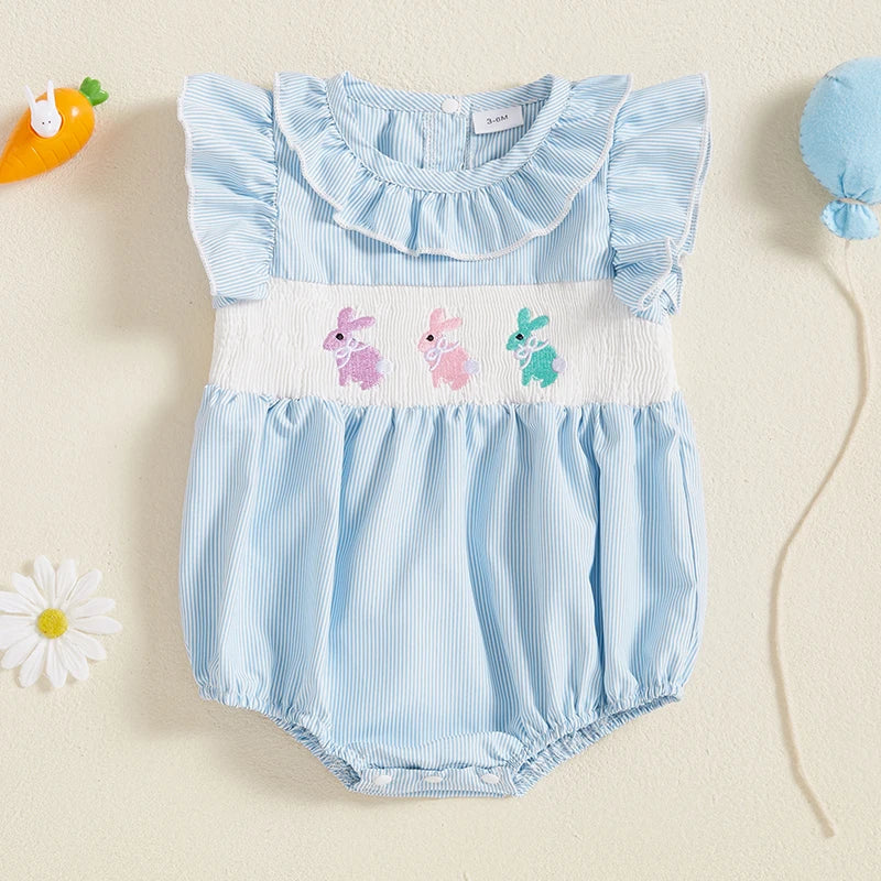 0-18M Baby Girl Easter Romper Short Sleeve Ruffle Collar Bunny Embroidery Smocked Bodysuit Newborn Outfit