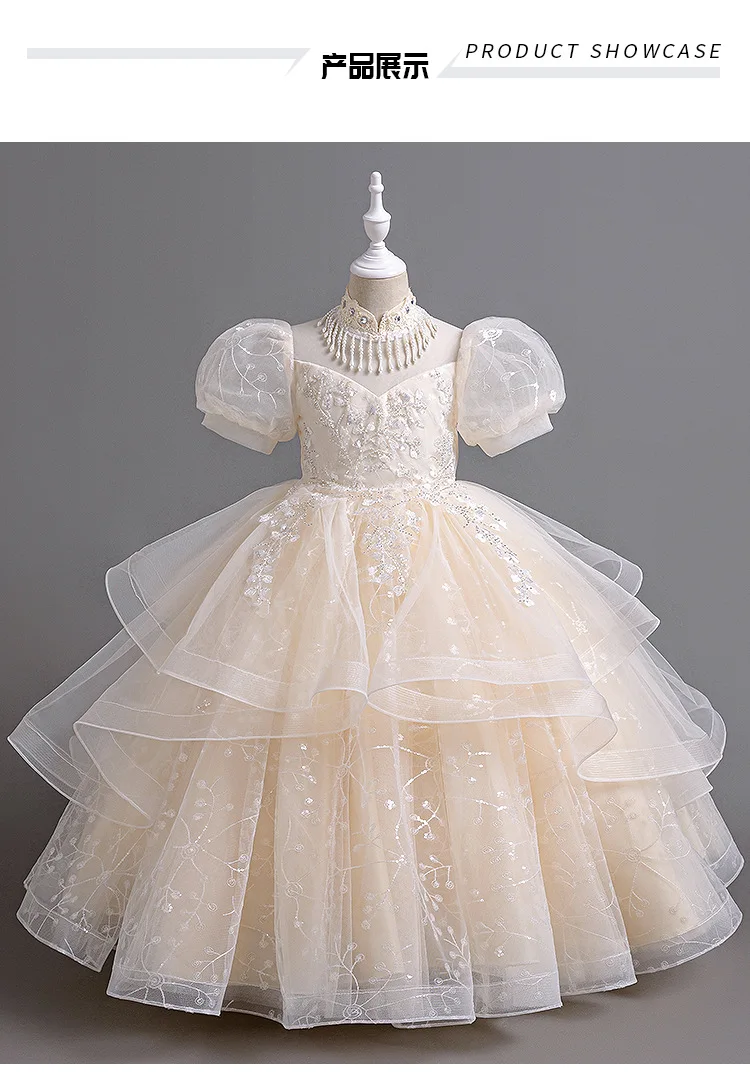 High-end Flower Girls Princess Sequins Wedding Christmas Party Dress Elegant Puff Sleeve Teenager Children Kids Gauze Vestidos
