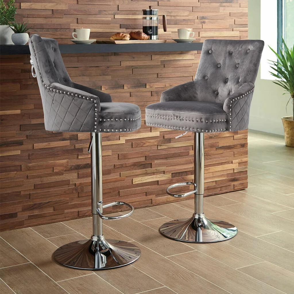 This 360° swivel bar stool is crafted from high-quality materials. The seat cover is made of velvet, with a high-resilience sponge interior. Copper nails secure and decorate the seat. The gas lift ensures smooth, durable rotation.