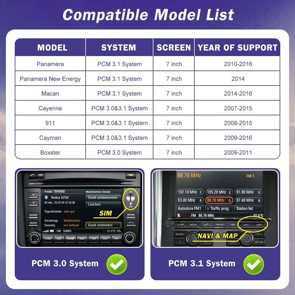 For Porsche Macan, Cayman, Cayenne, Bosxter/718, 911/918, Panamera PCM 3.1 system with 7 inch LCD screen: