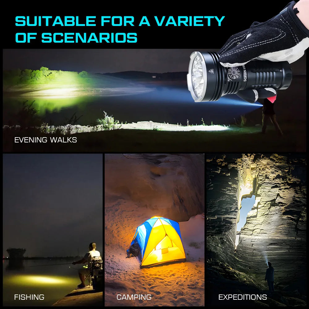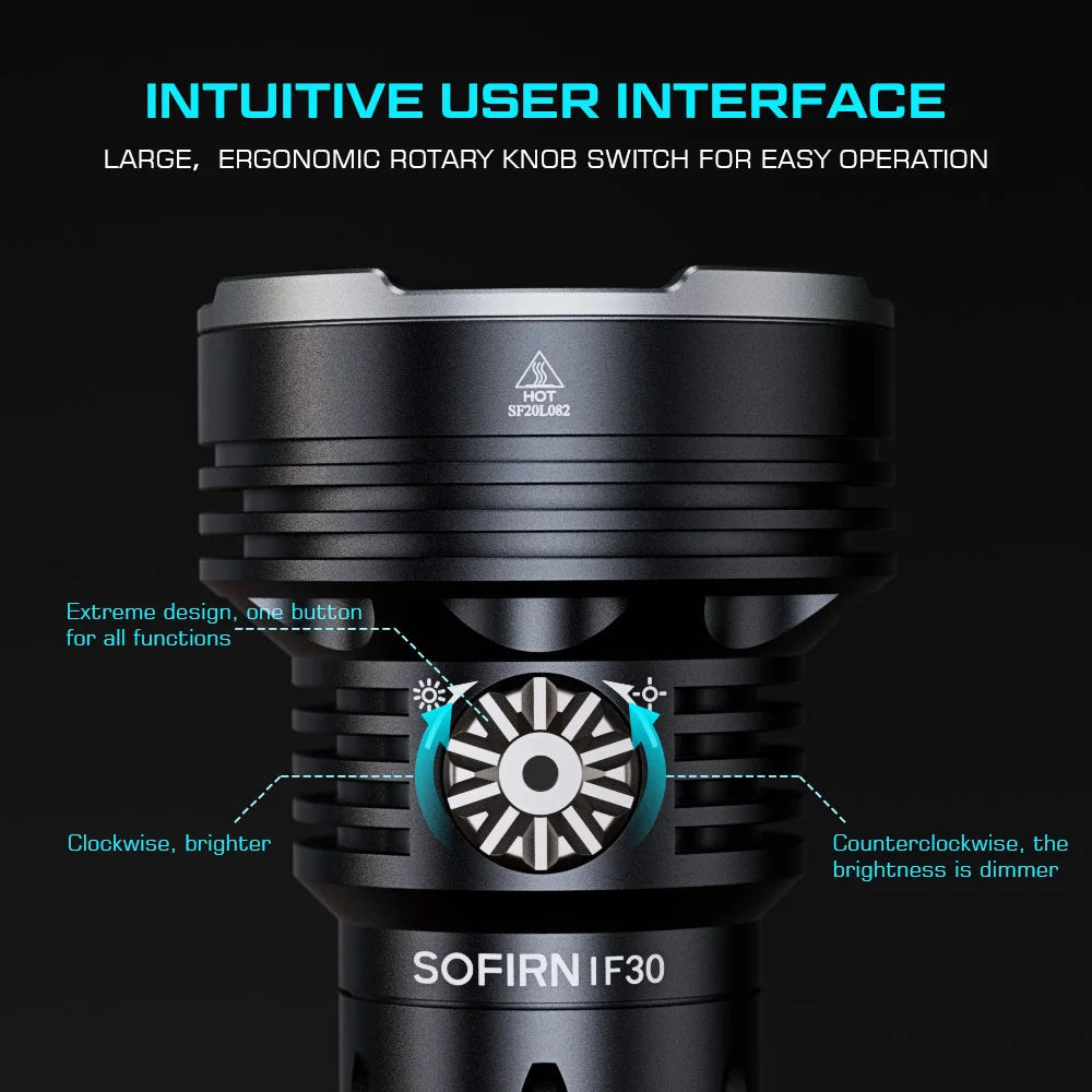 1. Impressive Output: With 1*SFT40 + 12 * TN-3535 LEDs surrounding the main light, the IF30 delivers an impressive 12000 lumens output for the flood beam and 2500 lumens for the center LED. Shines brightly on 685 meters path, enabling you great visibility in the dark. A must-have for hiking, search, rescue, emergencies, and more.