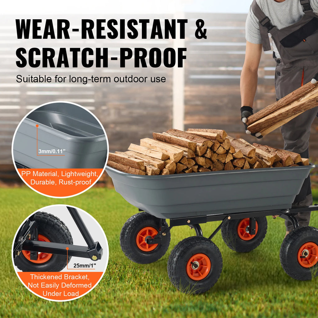 Heavy-Duty Load Capacity: Our dump cart can bear up to 600 lbs, effortlessly handling heavy loads. With a capacity of 4 cu.ft, it boosts your productivity. Its sturdy metal frame and surface coating ensure long-term durability.